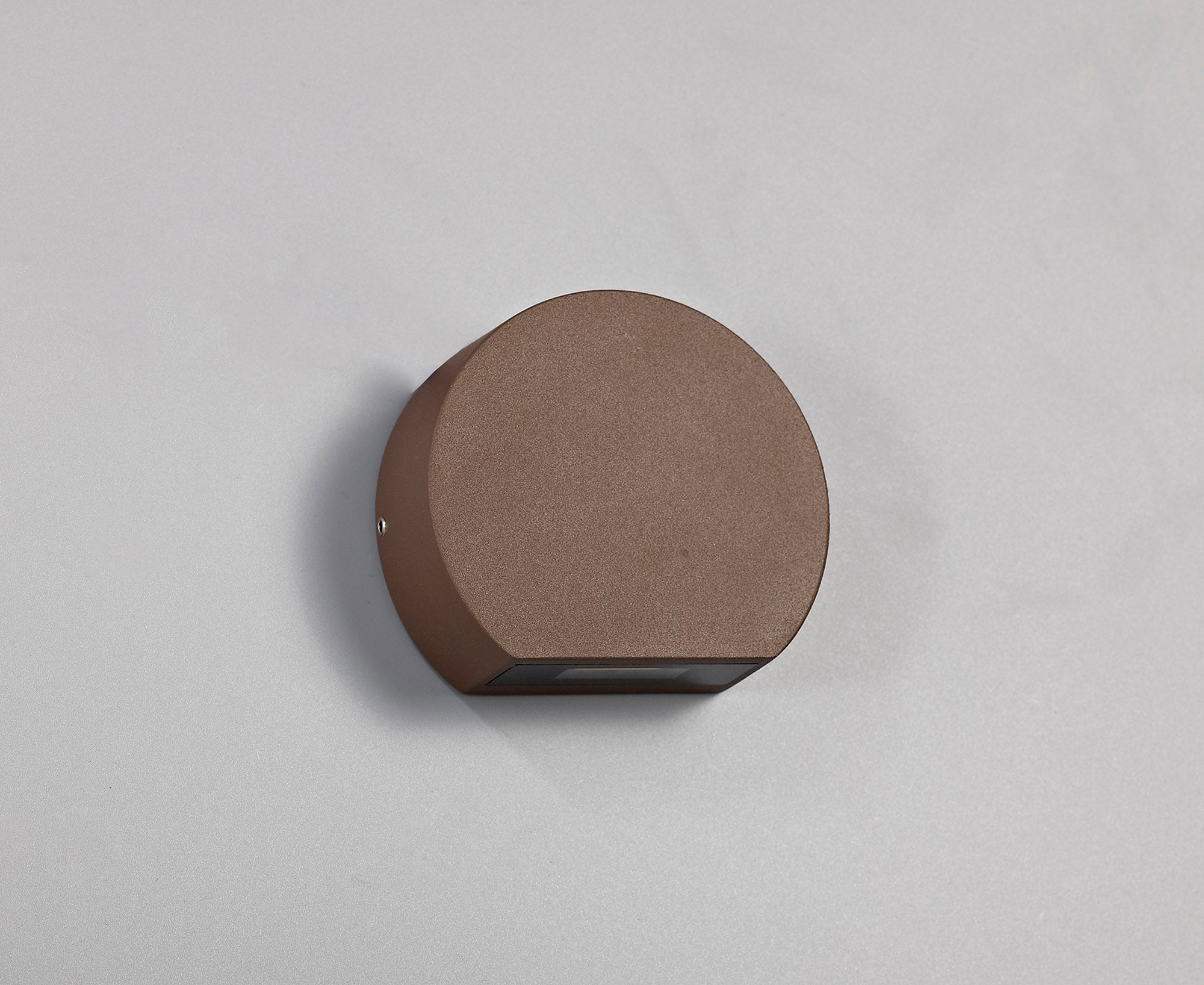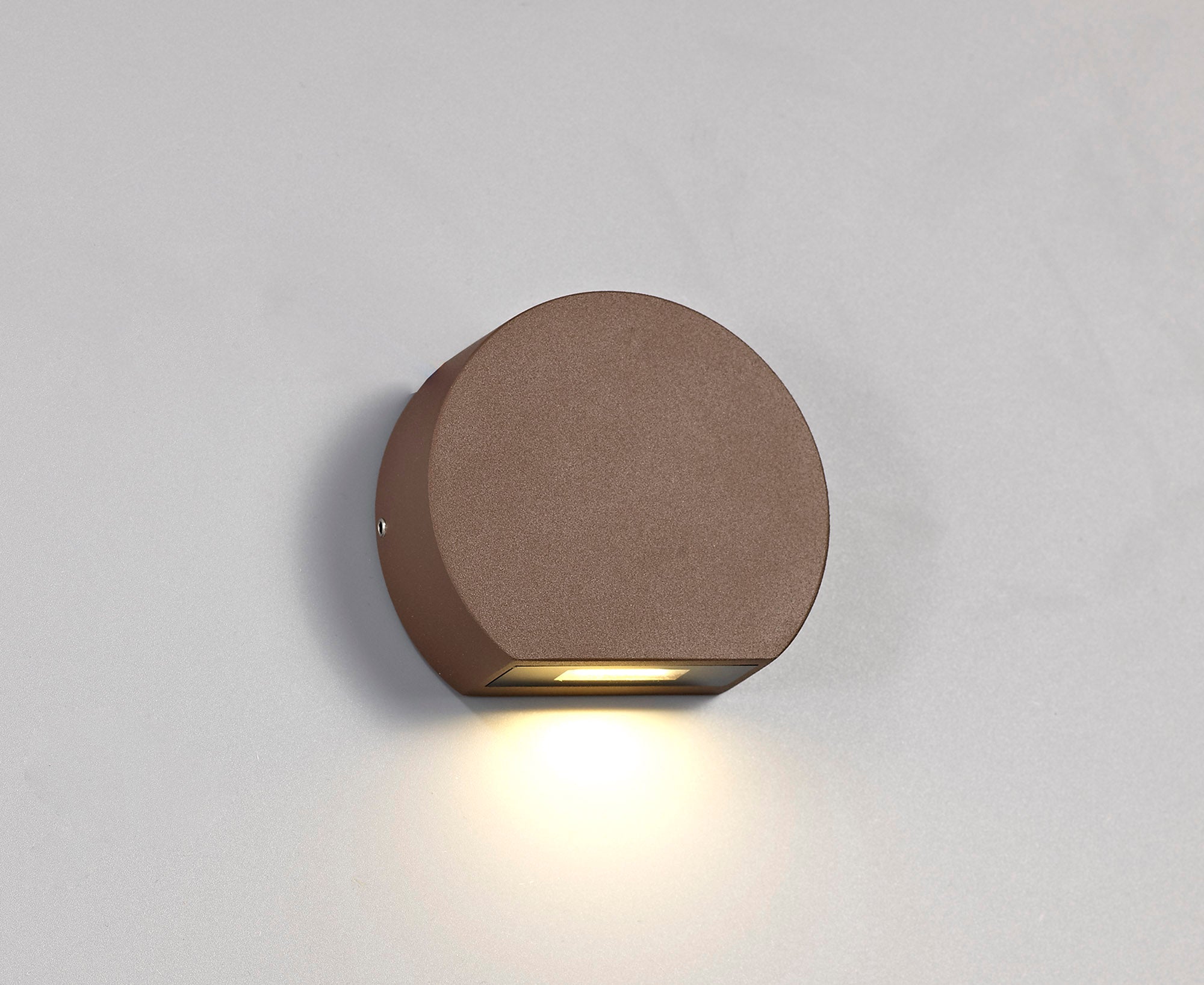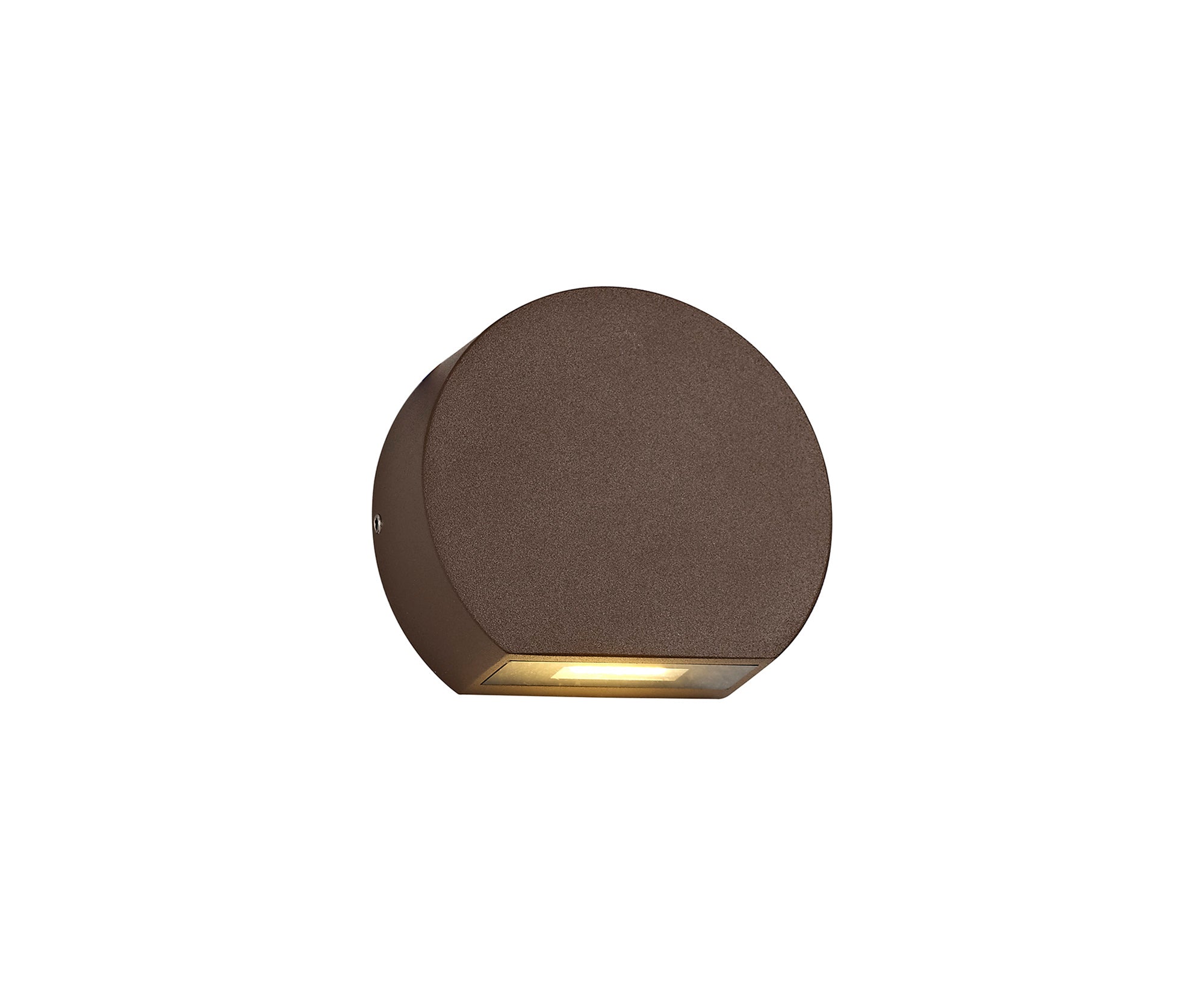 Ciana's dark brown colour finish complements the tones commonly found in outdoor environments from gurdens to pathways. This LED wall lamp offers a downlight direction of illumination. The circular form is slightly cut away at the bottom to diffuse the integral 3000K LEDs. The round three dimensional shape provides an effortless feature whether or not the wall lamp is on.