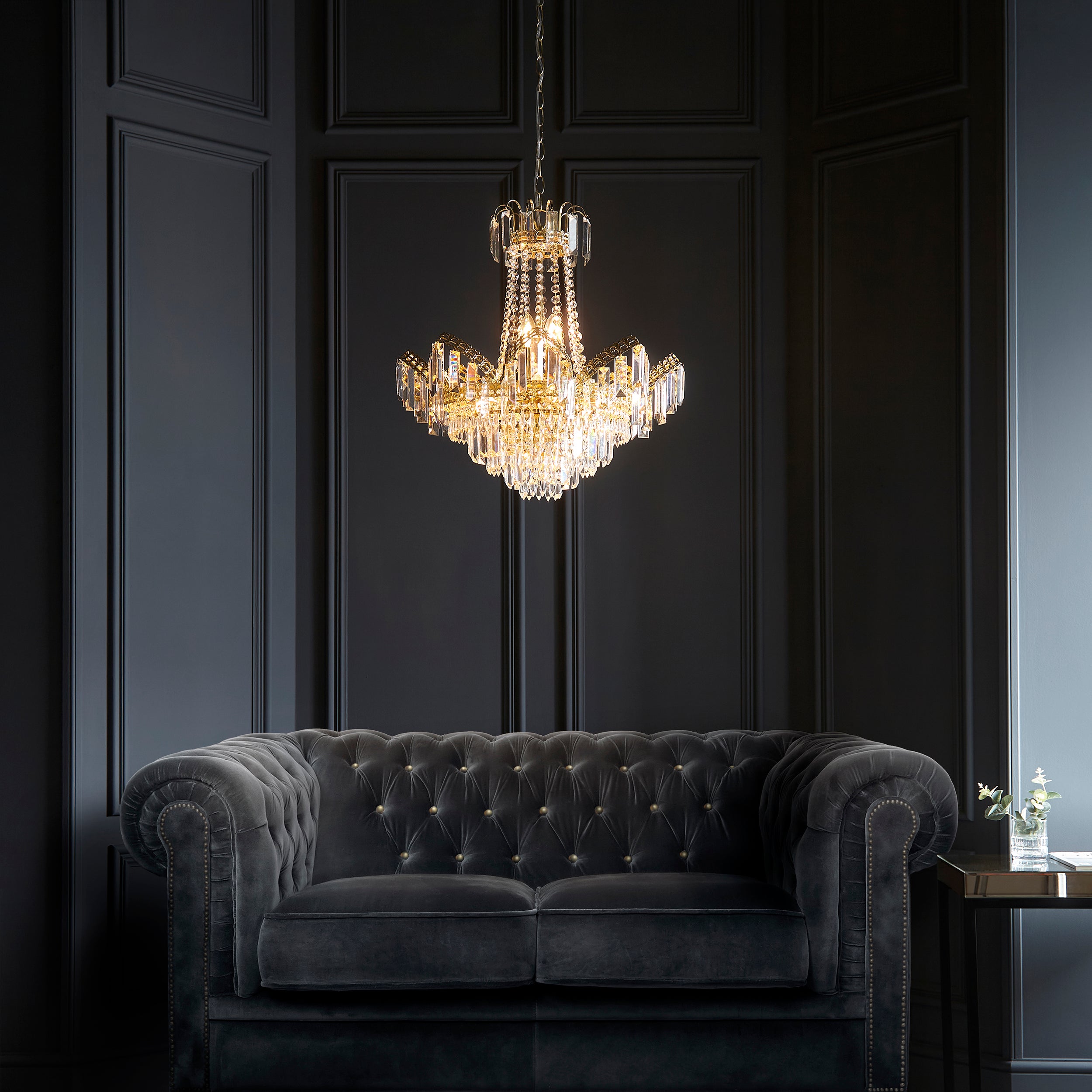 Create the perfect centrepiece for the most loved room of your home with this opulent 9 light pendant. Featuring a striking mix of intricate glass faceted beads and droplets, finished in a gold coloured plate.