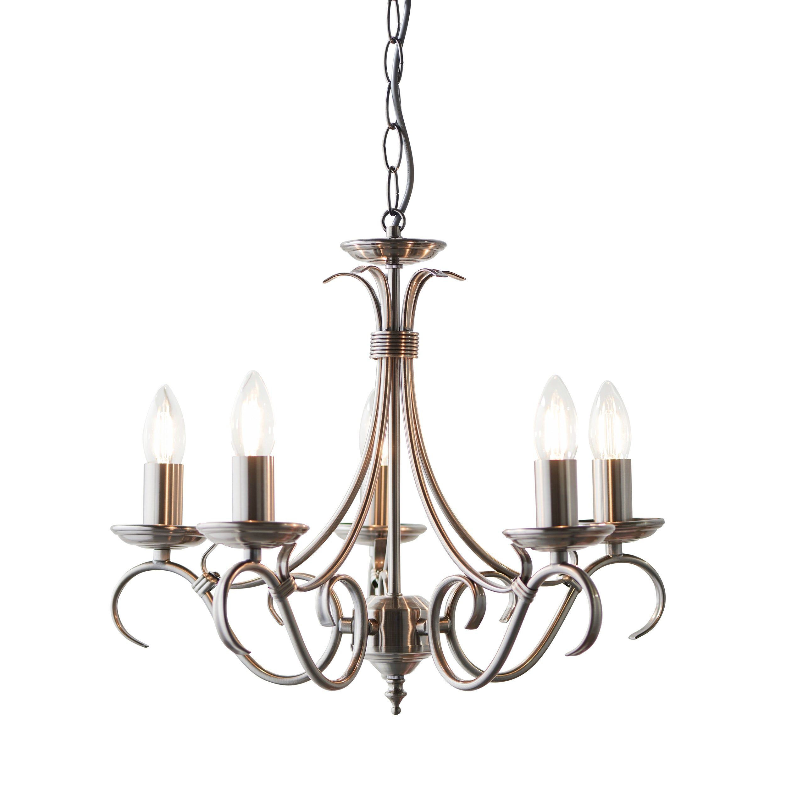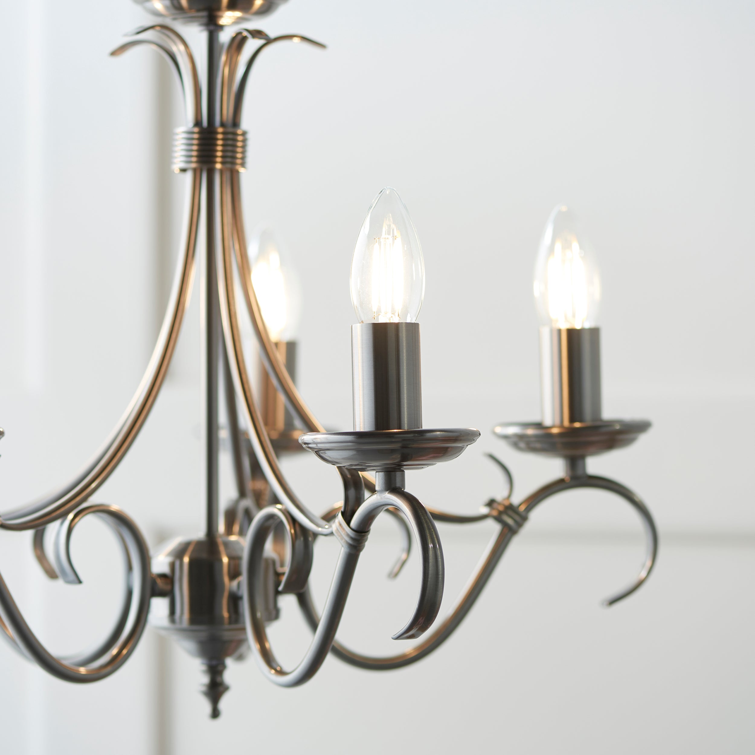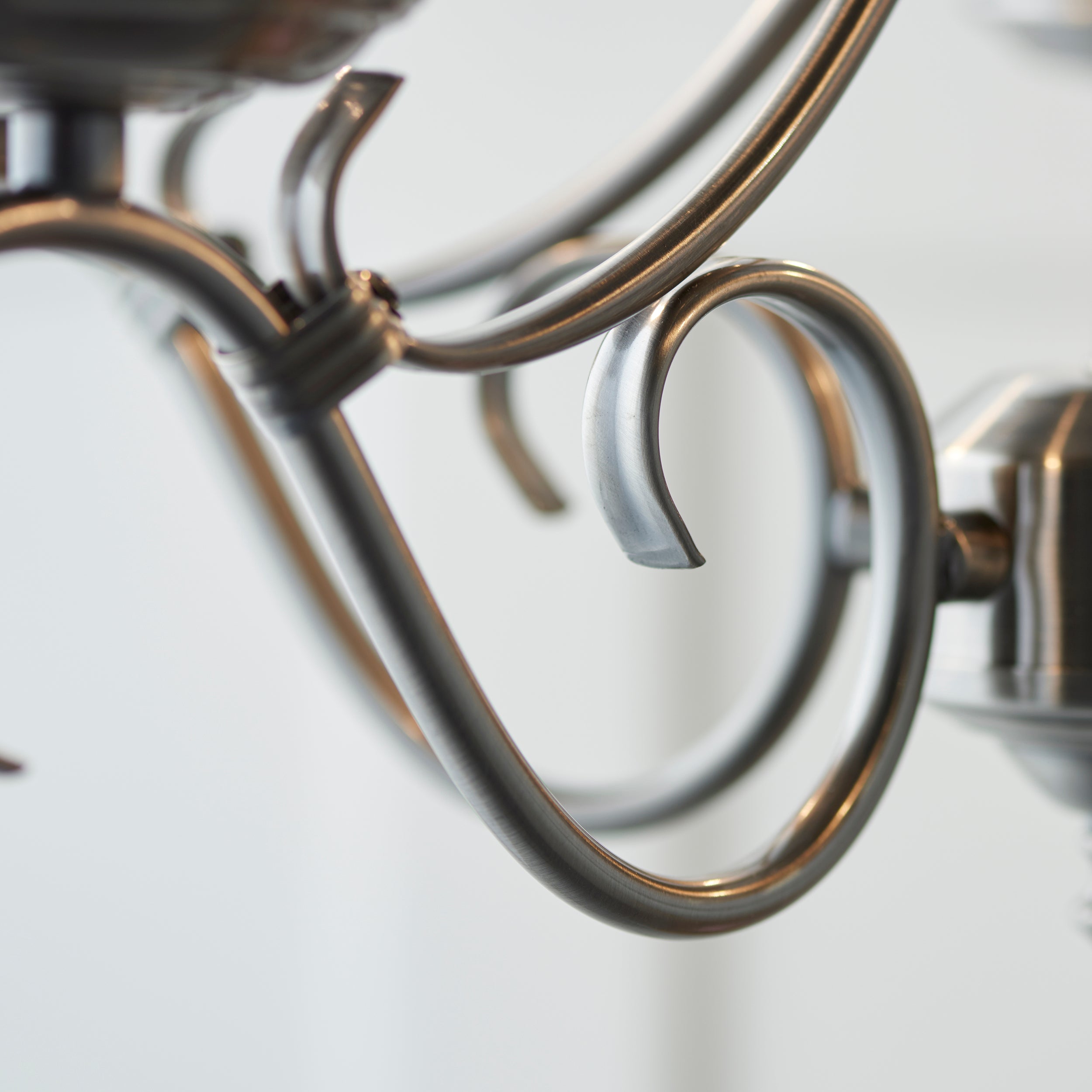 A 5 light ceiling fitting with scrolled arms in antique silver effect finish. suitable for use with LED lamps, height adjustable and dimmable. Matching items available and also comes in an antique brass finish