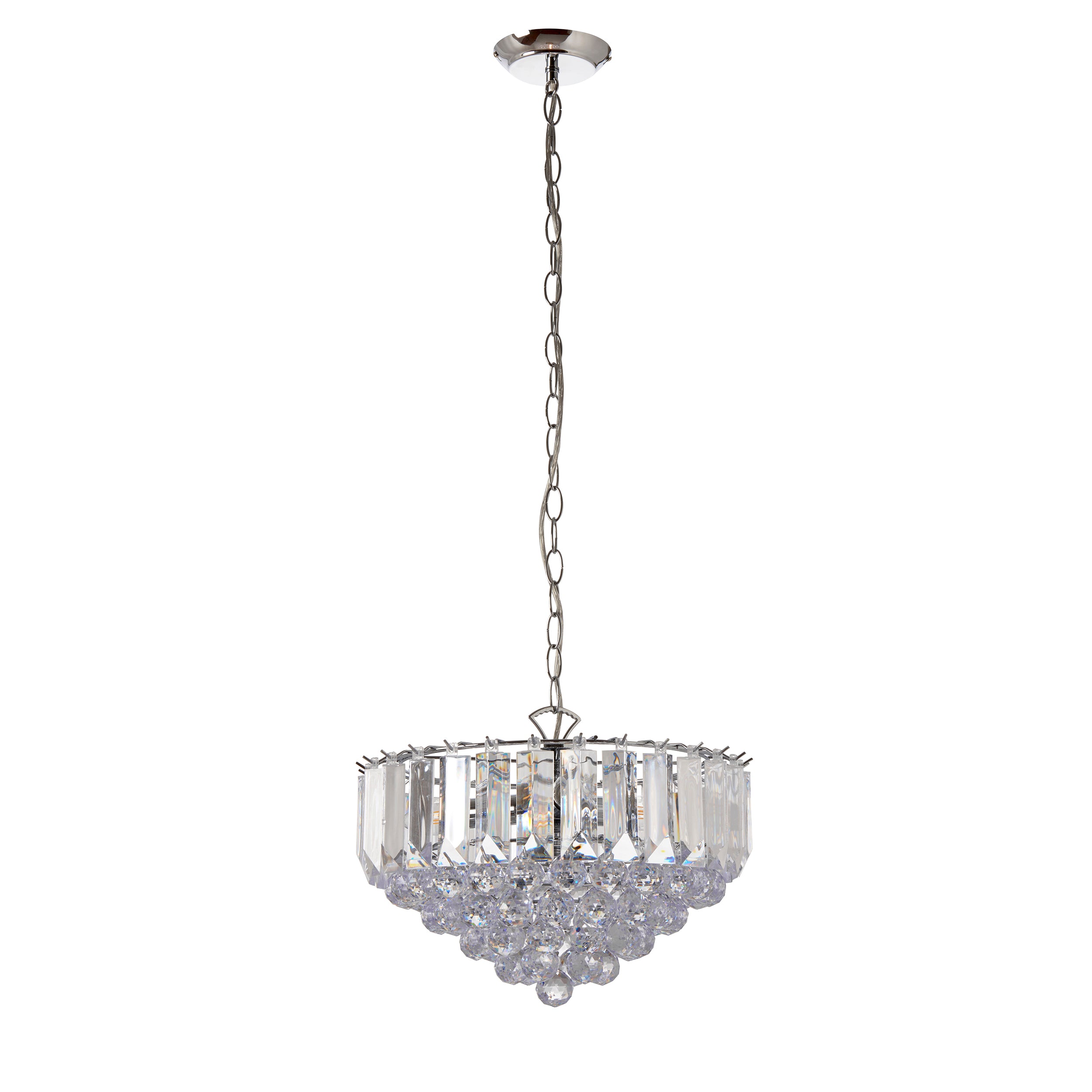 The Fargo pendant is finished in chrome effect with clear acrylic detailing. This fitting has a height adjustable drop, is dimmable and suitable for use with LED lamps. Other fittings and finishes also available within the range