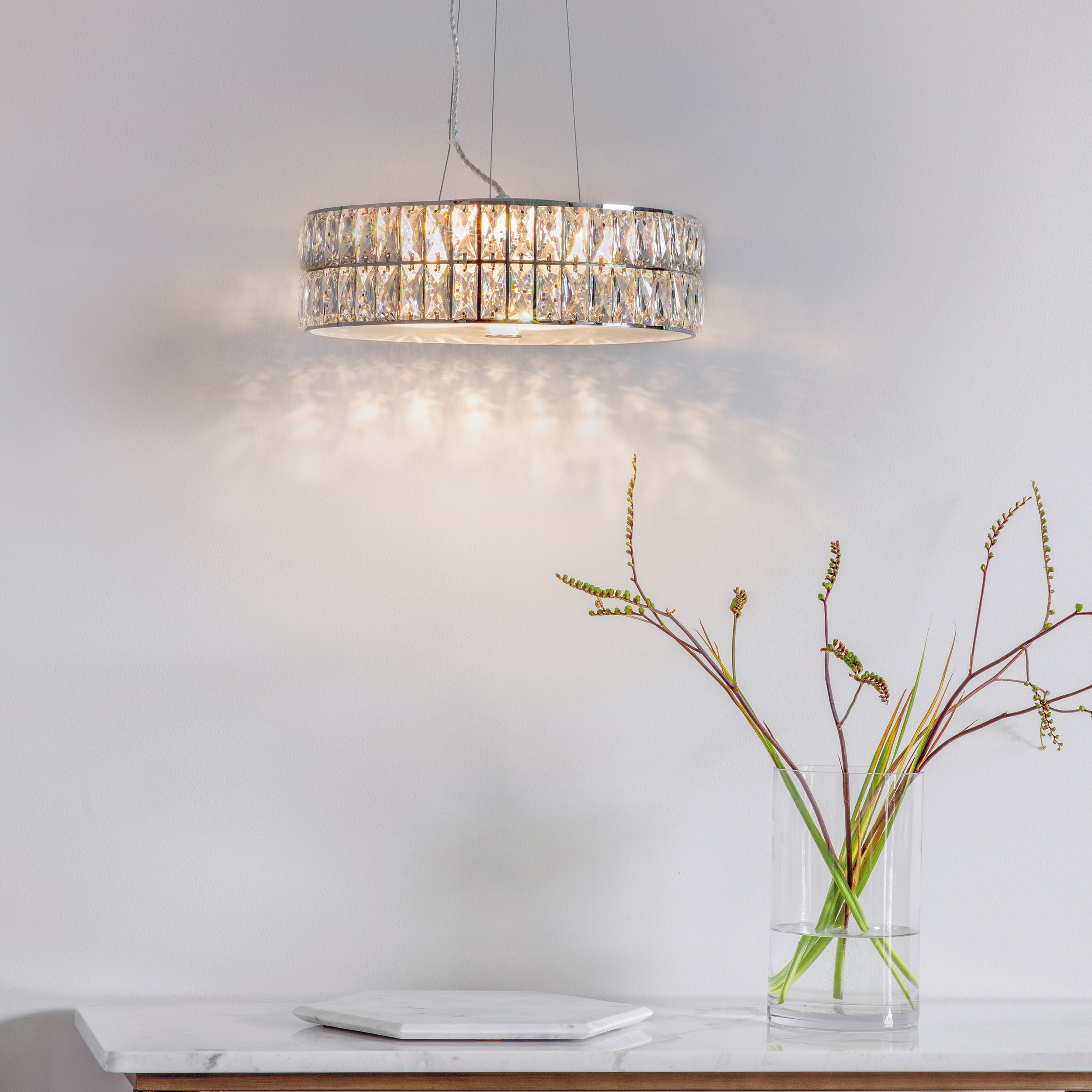 High quality clear crystals adorn this deluxe chrome plated LED contemporary pendant, fully enclosed by a beautiful prismatic glass diffuser. The combination of clear crystals, polished chrome and glass create a luxurious interior decorative light pendant. Suspended from thin wire and clear flex with integrated LED light source for bright light output.