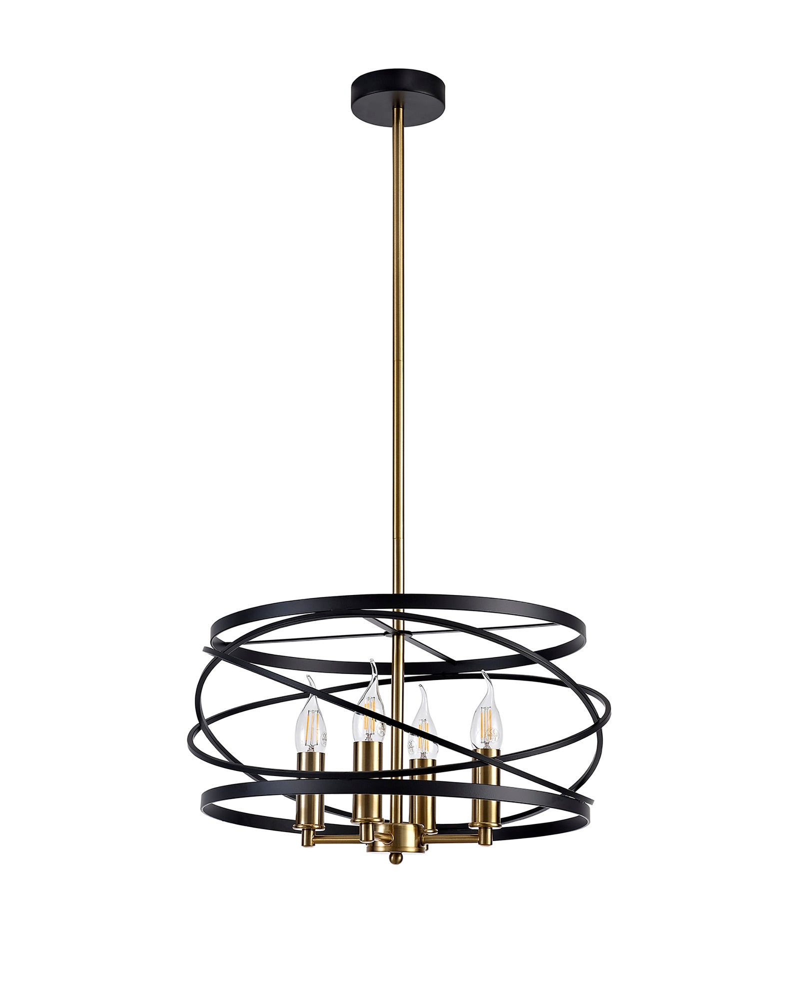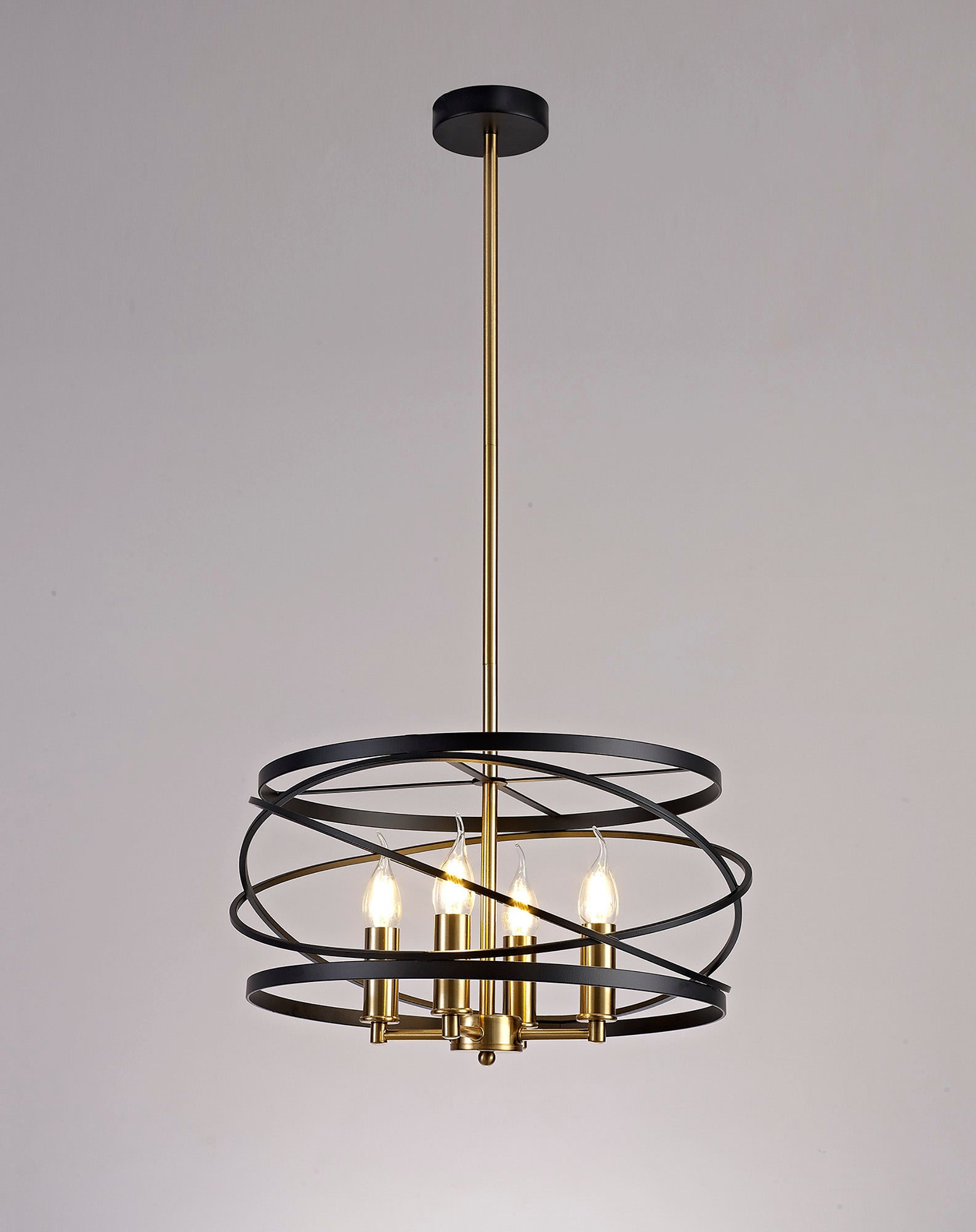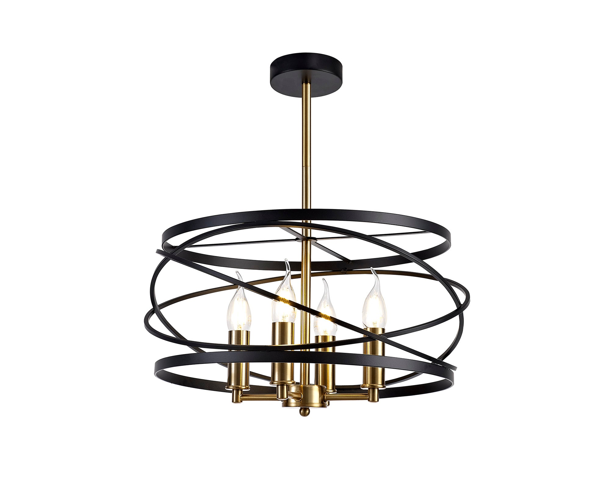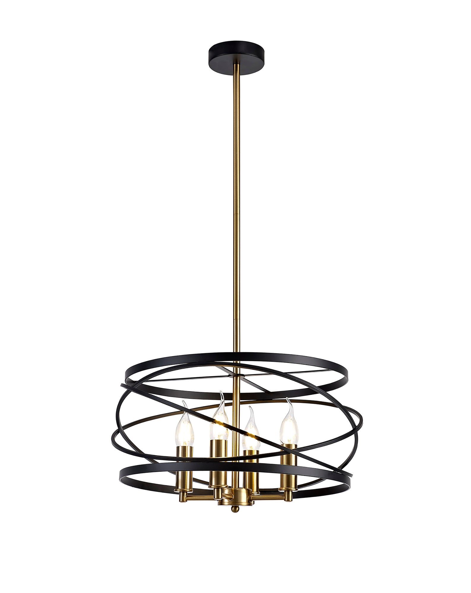 Connaught's intricately structured frame encircles the four E14 lampholders with over lapping angled rings. The chaotic positioning of this central feature is brought into order by the slightly wider, vertical rings positioned at the top and bottom of the frame producing a drum like shape overall. This pendant emits a classical distinguished air suitable to complement or create a stylish room d�_cor. The black and satin gold colour is the final sophisticated touch to complete an elegant traditional pendant.