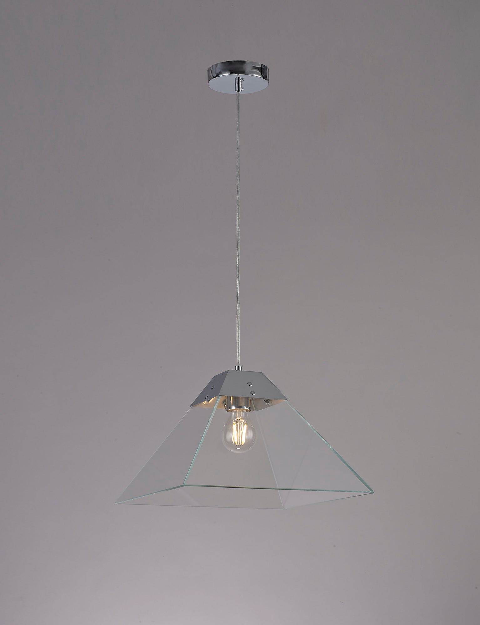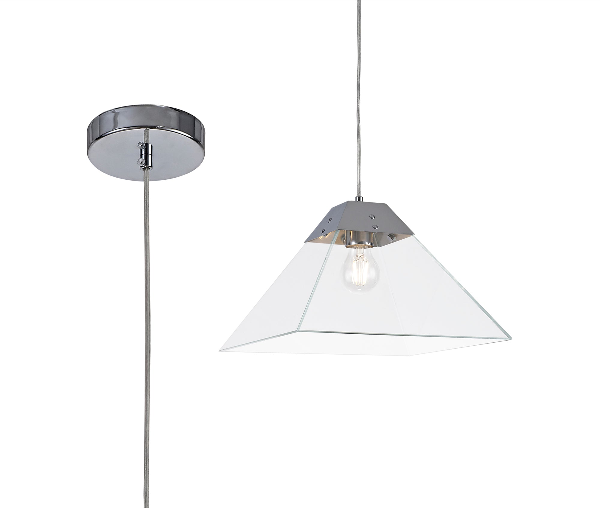 Elmont utilises the maximum output possible for the chosen E14 or E27 lamp, by transferring the traditional pyramid shape of fabric shades onto a transparent material. The open glass forms not only allow a wider projection of light from the open space but also permit a more overall ambient dispersion of light through the clear glass sides. The wall lamps within this collection are particularly prominent with the trapezium plate reflecting the lines of the glass housing. Both the single pendants and wall lamps are available in either a polished chrome or antique brass colour finish.