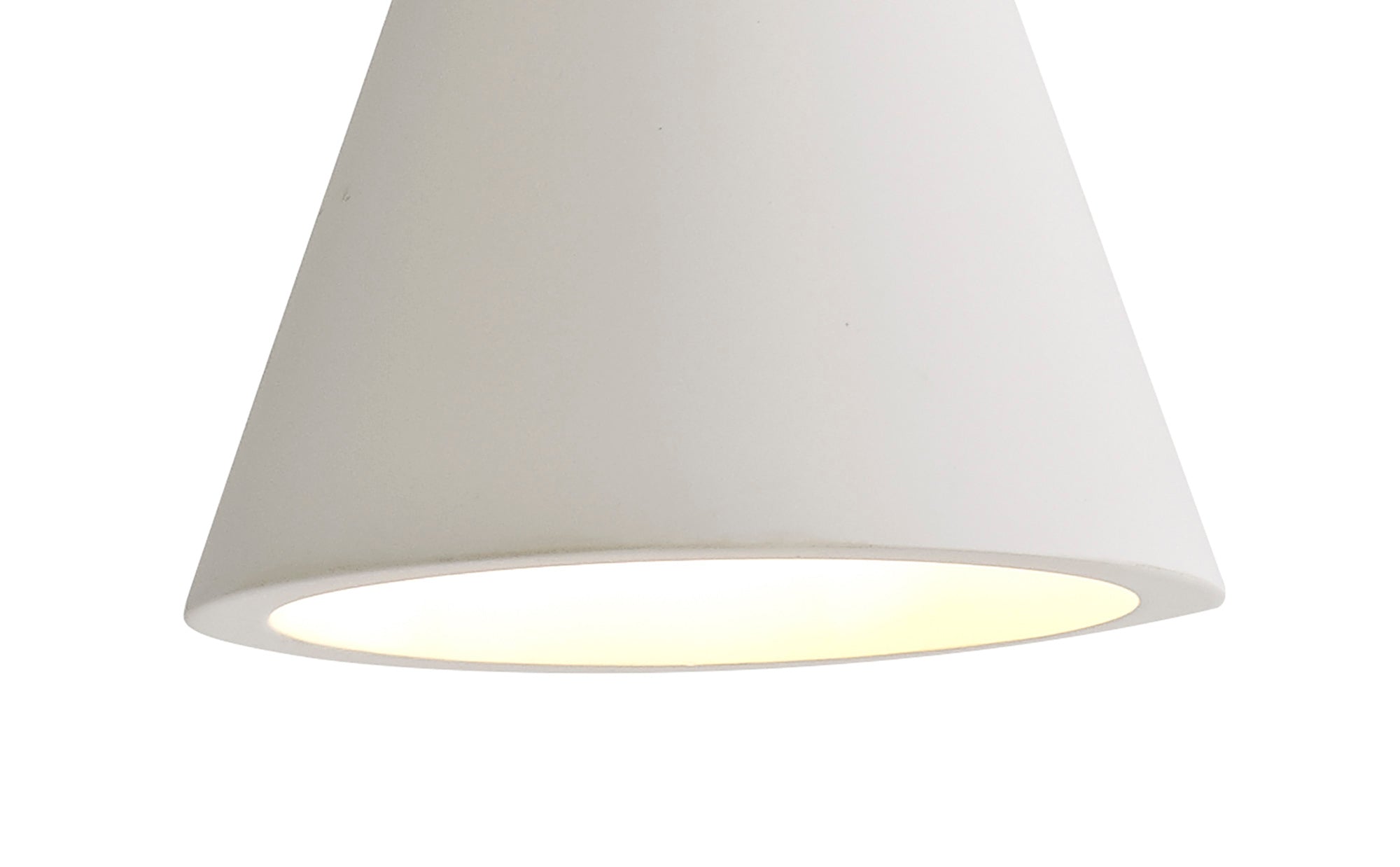 Plastin is a selection of downlights, wall lamps and two single pendants that have been specified for use in both industrial and domestic settings. The most highly appealing feature of this collection is the white gypsum finish which is paintable making the fixtures adaptable to specific needs and taste. The stepped downlights are available in round or square but the wall lights offer the most varied options. A rectangular recessed GU10 wall lamp is available in three size options while the LED wall lamp is a unique uplighter with integral 3000K light. There are also three originally formed wall lamps that take a single G9 lamp, the most intriguing of these three being the three dimensional prism shaped uplighter.