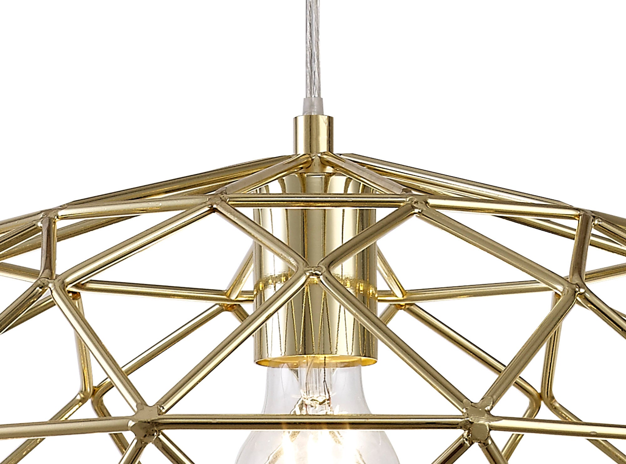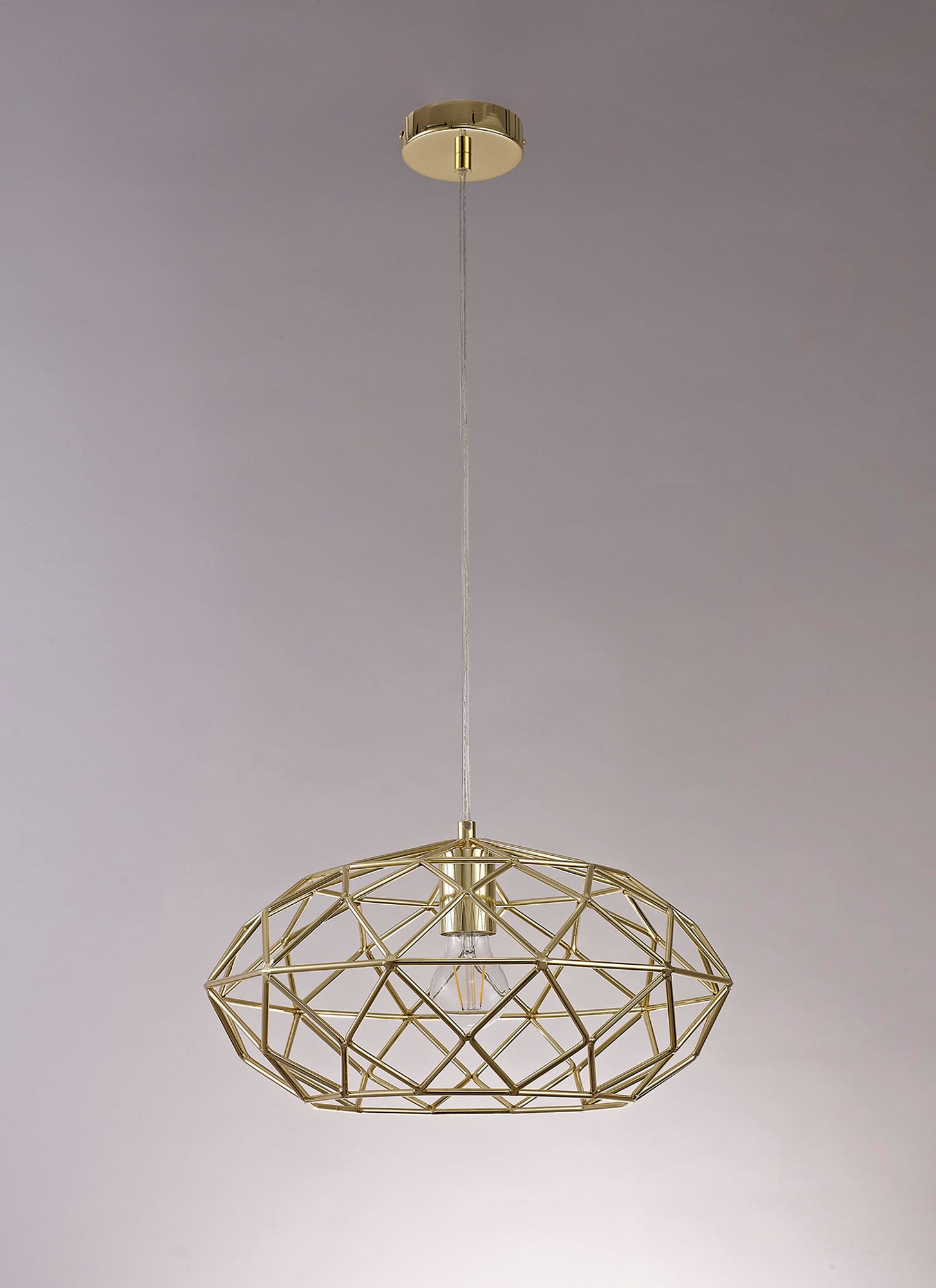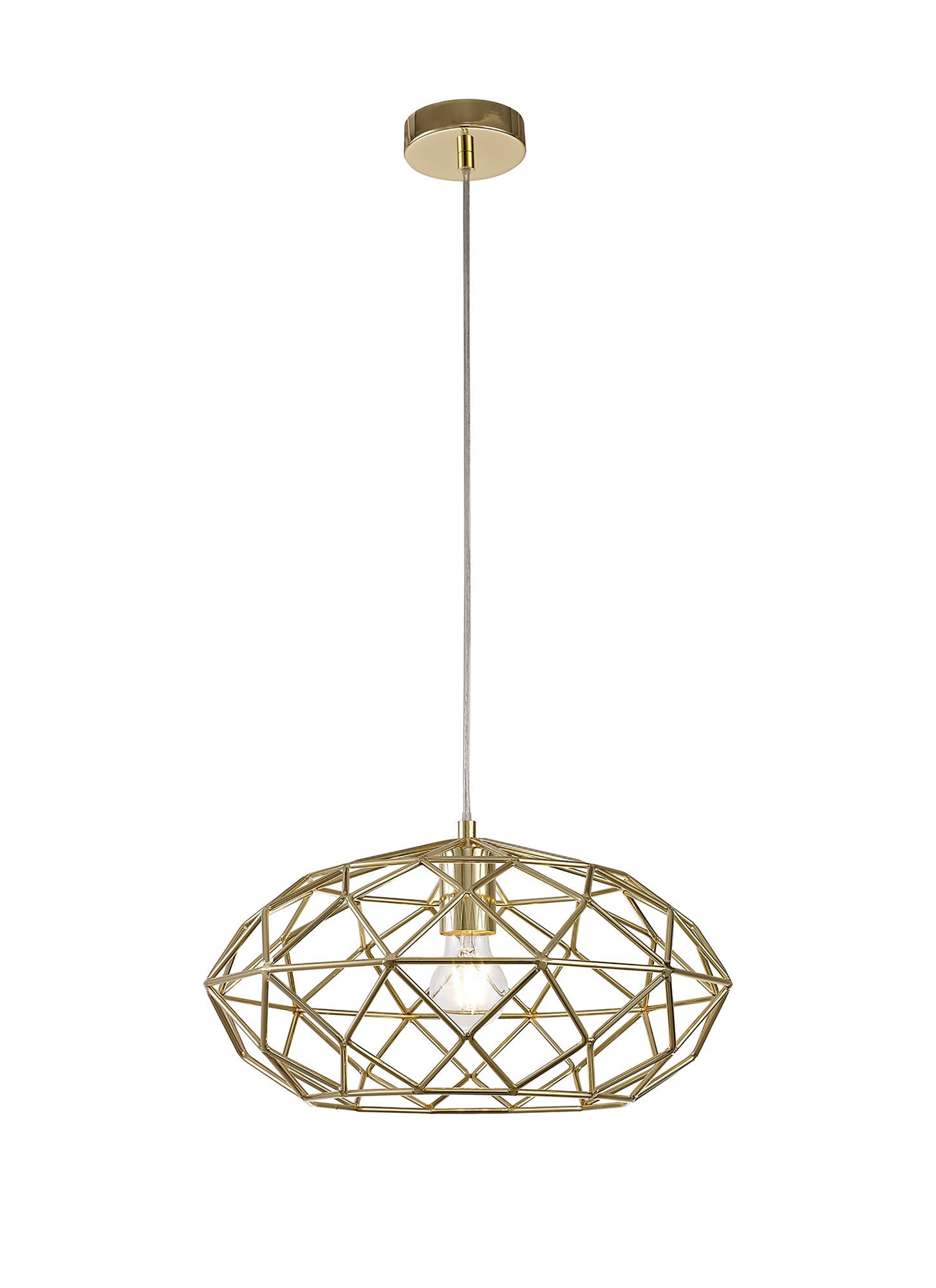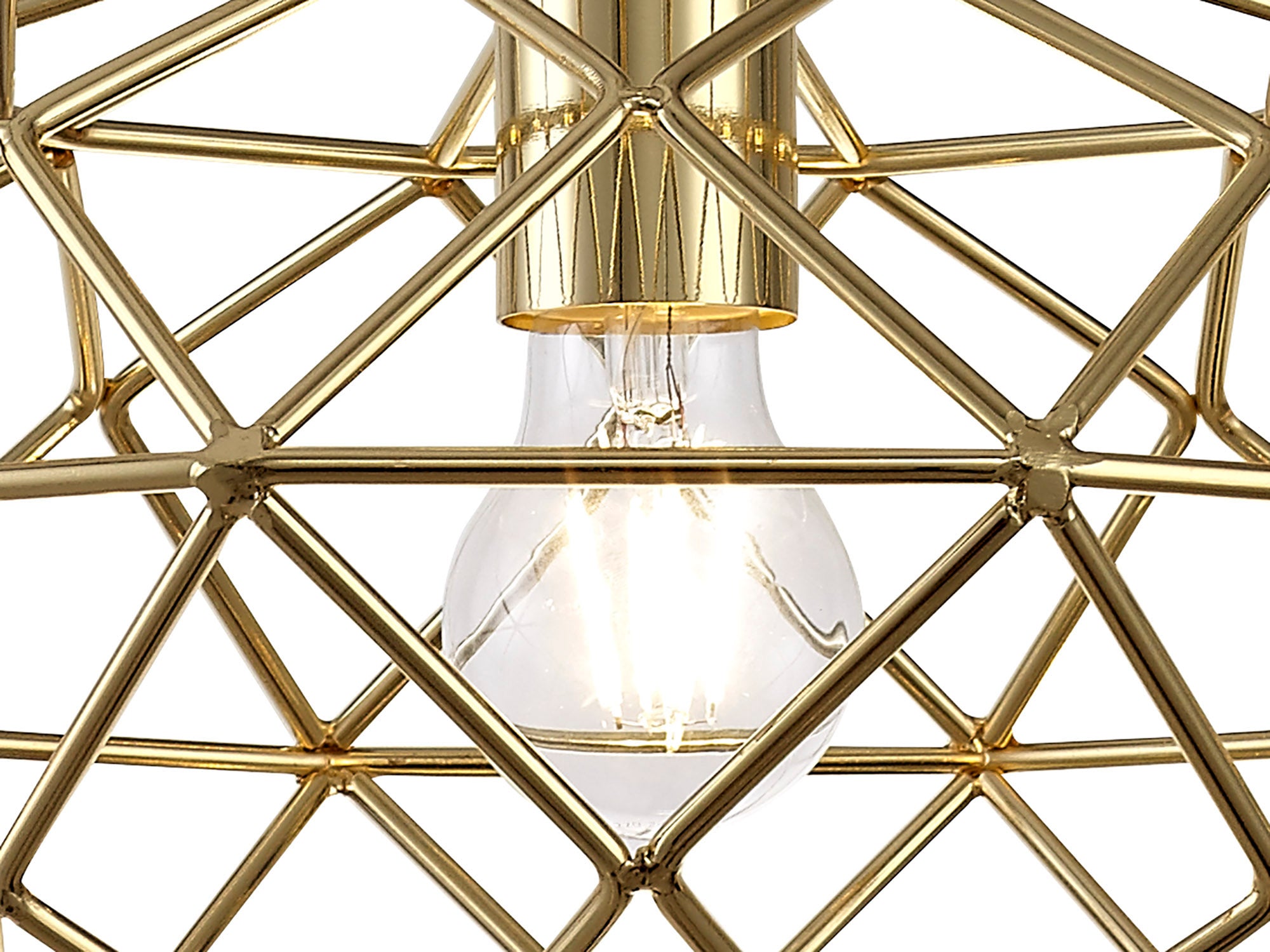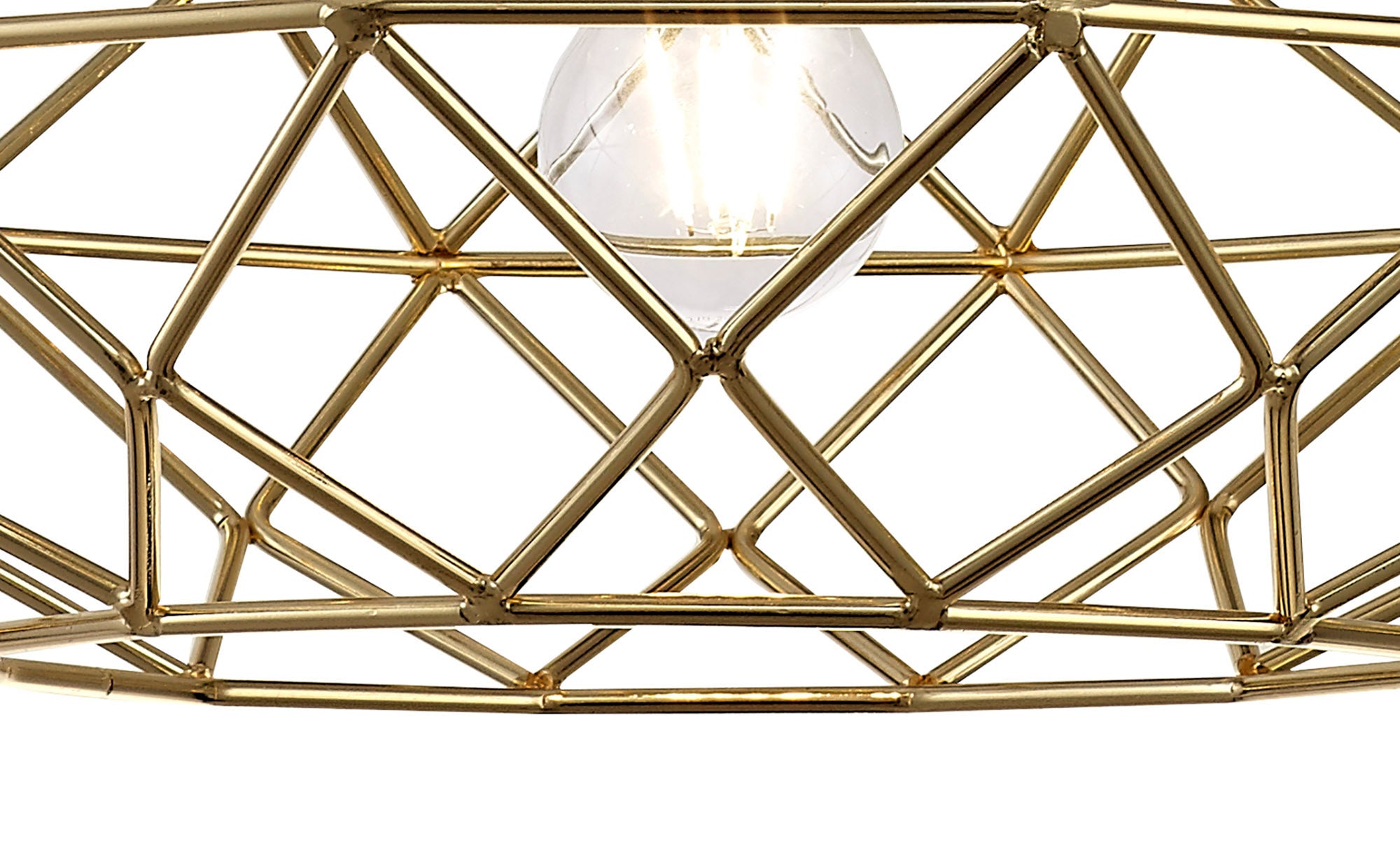 The Trimond collection is comprised of a trio of traditional lights, two pendants and one flush ceiling, each with their own unique shape. A body of open triangular and diamond shapes are tiled together to create a prismatic optical illusion around the singular E27 lampholders. A traditional polished brass finish ensures Trimond can be used to enhance the character and eye-catching design of a rustic of contemporary setting with optimum illumination.