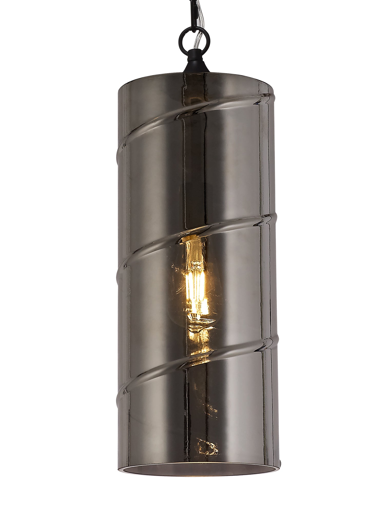 These cylindrical glass pendants present an inspired moulding creating a three dimensional spiral protrusion, extending around the shade. The three different frame colours available in the Cylvie range correspond the colour tint used for the glass itself; antique brass with amber glass, matt black with smoked glass or polished chrome with clear glass.