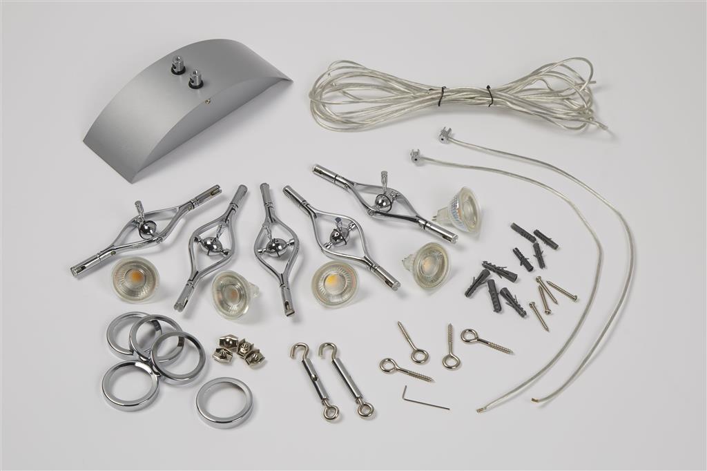 When lit, this attractive cable kit provides a beautiful spread of radiant glow, perfect for kitchens or dining rooms. With 5 lights, chrome and a minimal design the item focuses on being functional. LEDs use up to 85% less energy and last up to 20 times longer than incandescent bulbs.