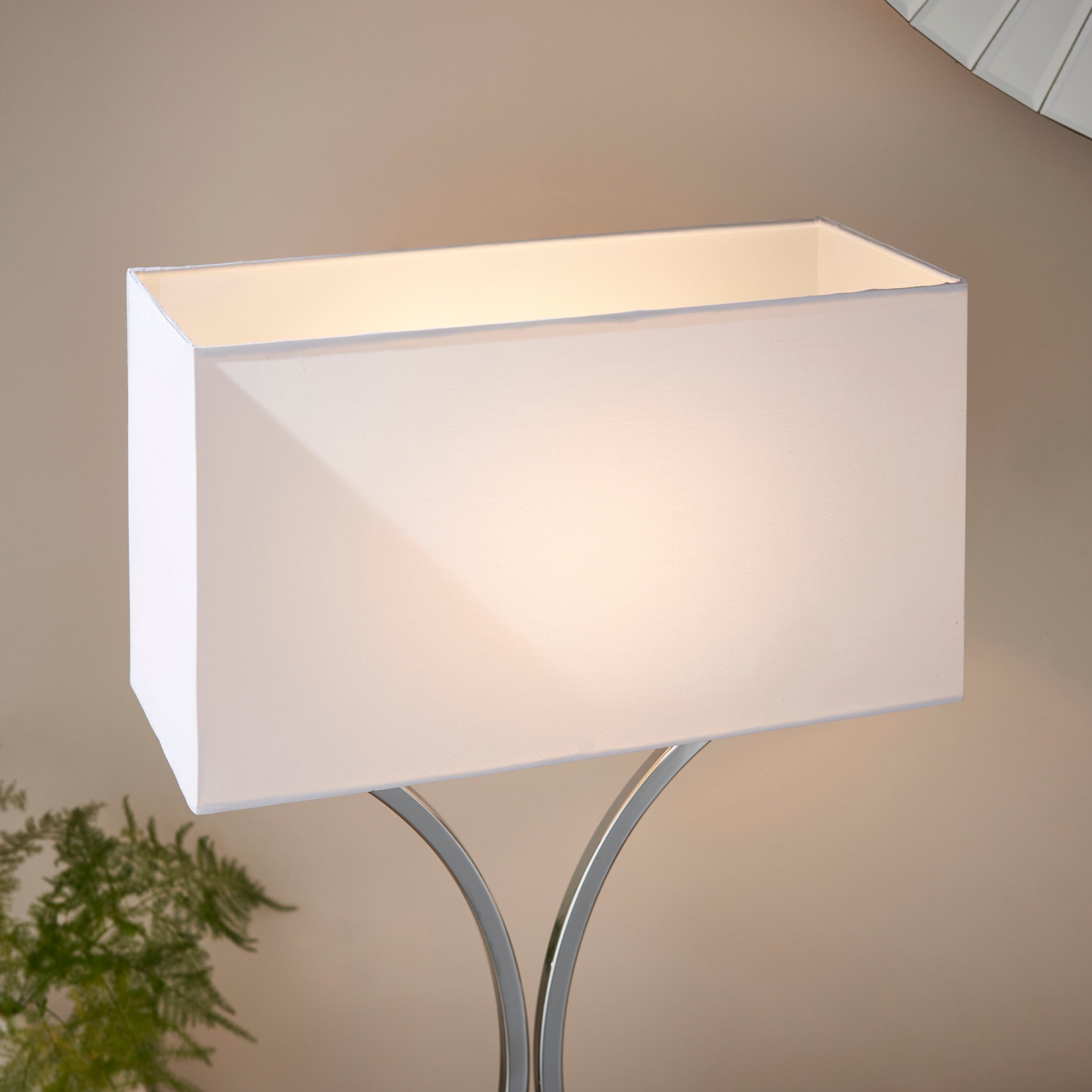 This table lamp features an unusually shaped body atop a rectangle base, all finished in chrome topped with white square shade. suitable for use with LED lamps and supplied with inline switch