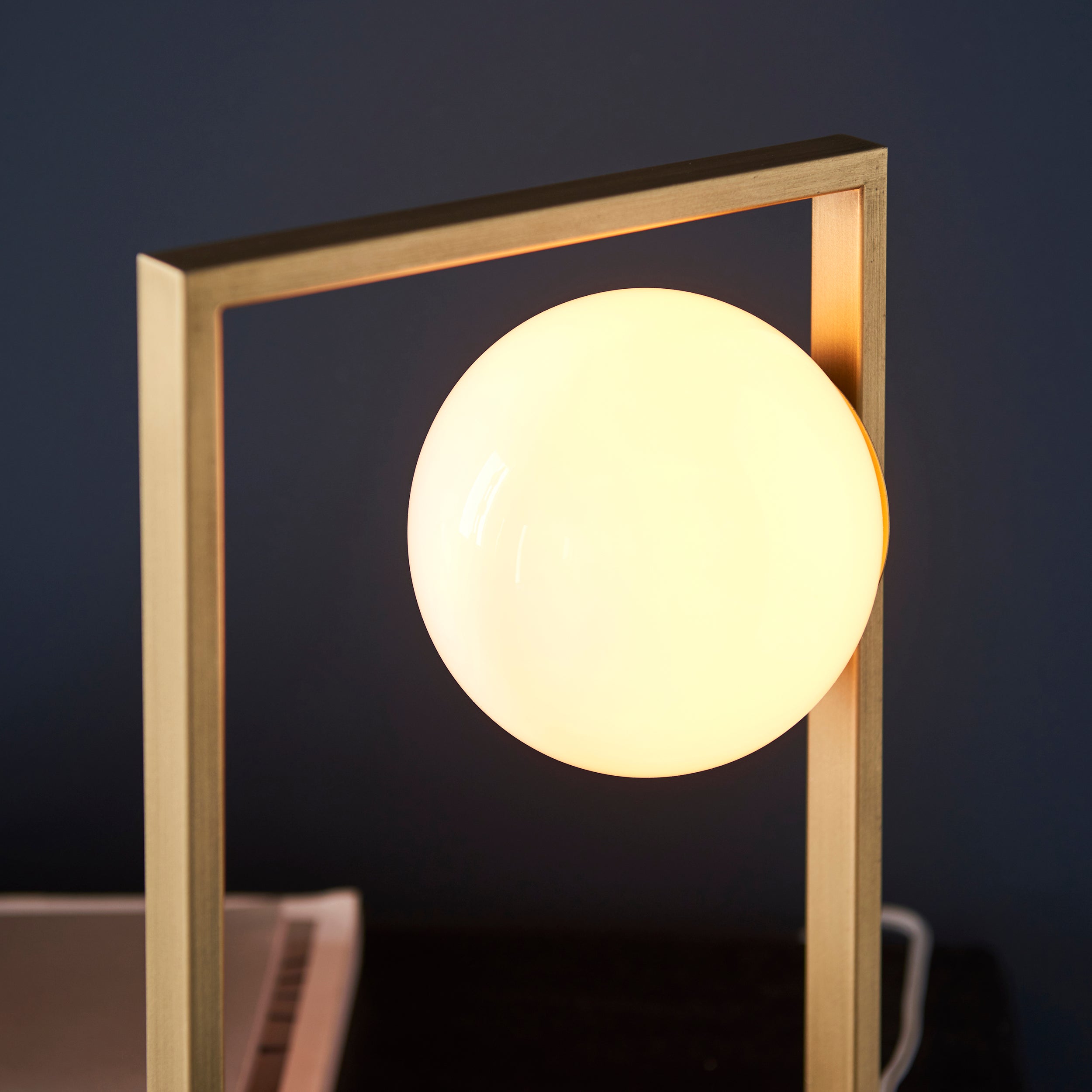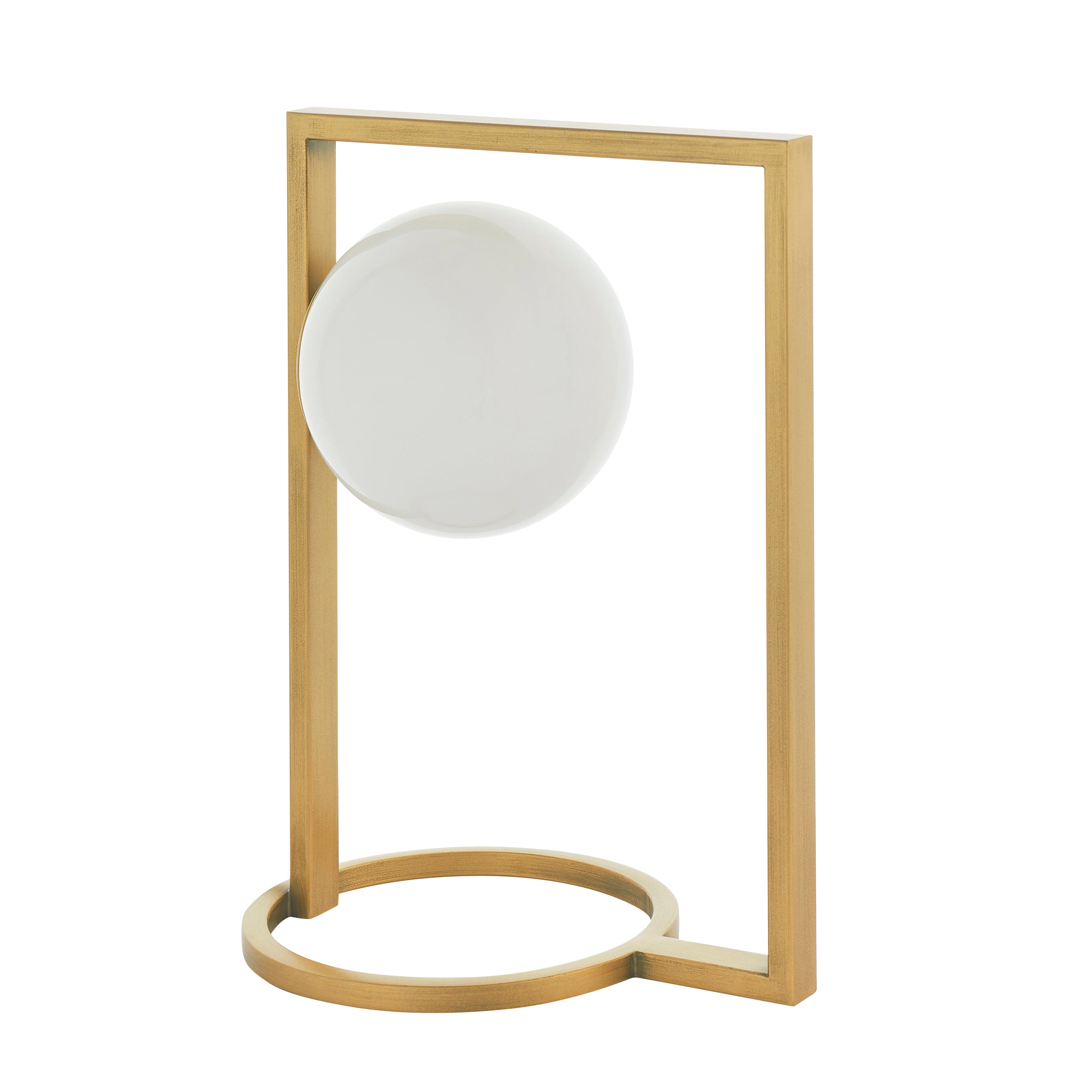 This sleek, geometric table light features an angular, asymmetric brushed gold stand supporting a single opal glass sphere which creates an atmospheric glow. Combine with the floor light from the same range for a coordinated look.