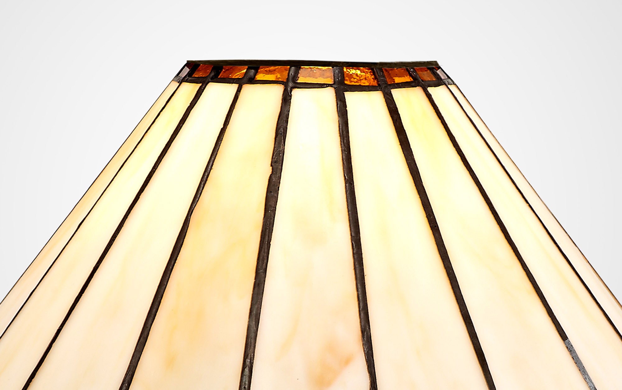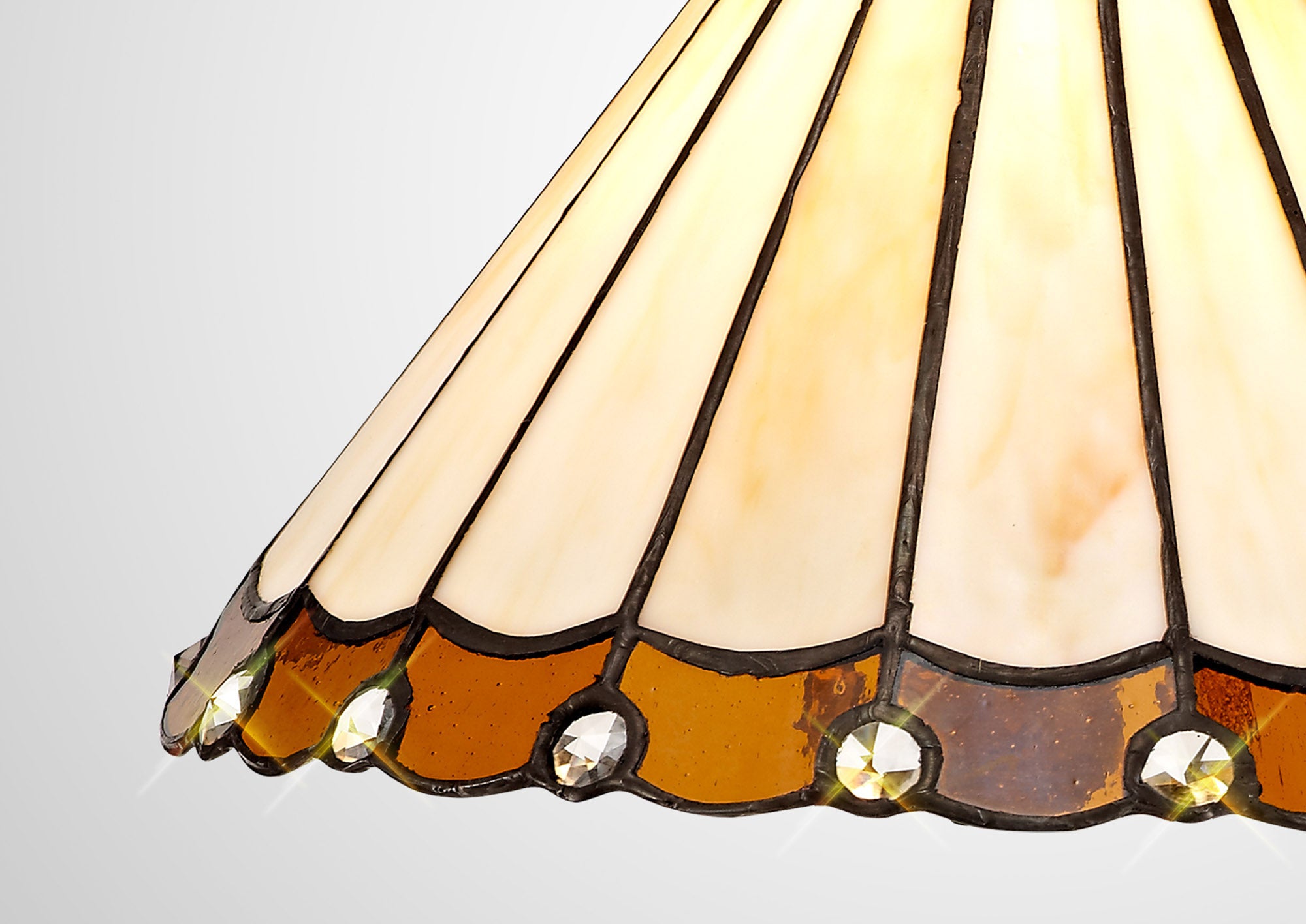 Umbrella uses a traditional Tiffany shade but with a modern twist. The fanned feather shapes forming the umbrella glass is mostly crealm coloured with the curved tips of each point available in either green, brown, red, blue or grey. The modern component takes the form of small clear crystal pieces fixed on alternating points of the shades rim furthrineg the ranges noble appeal.