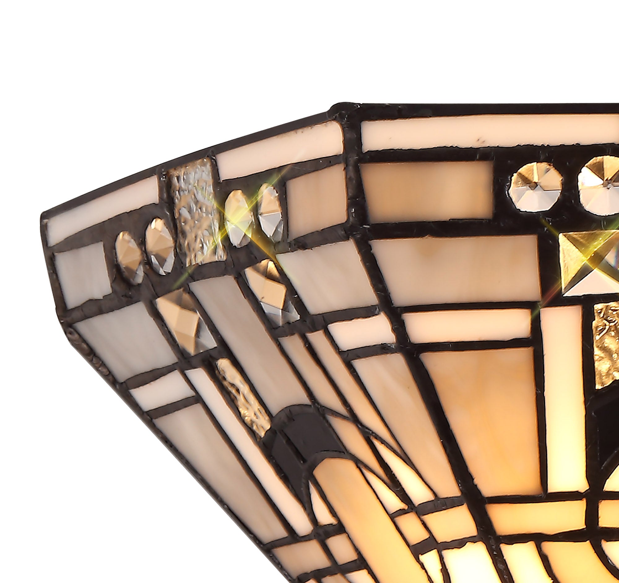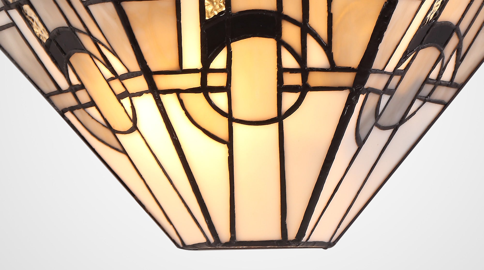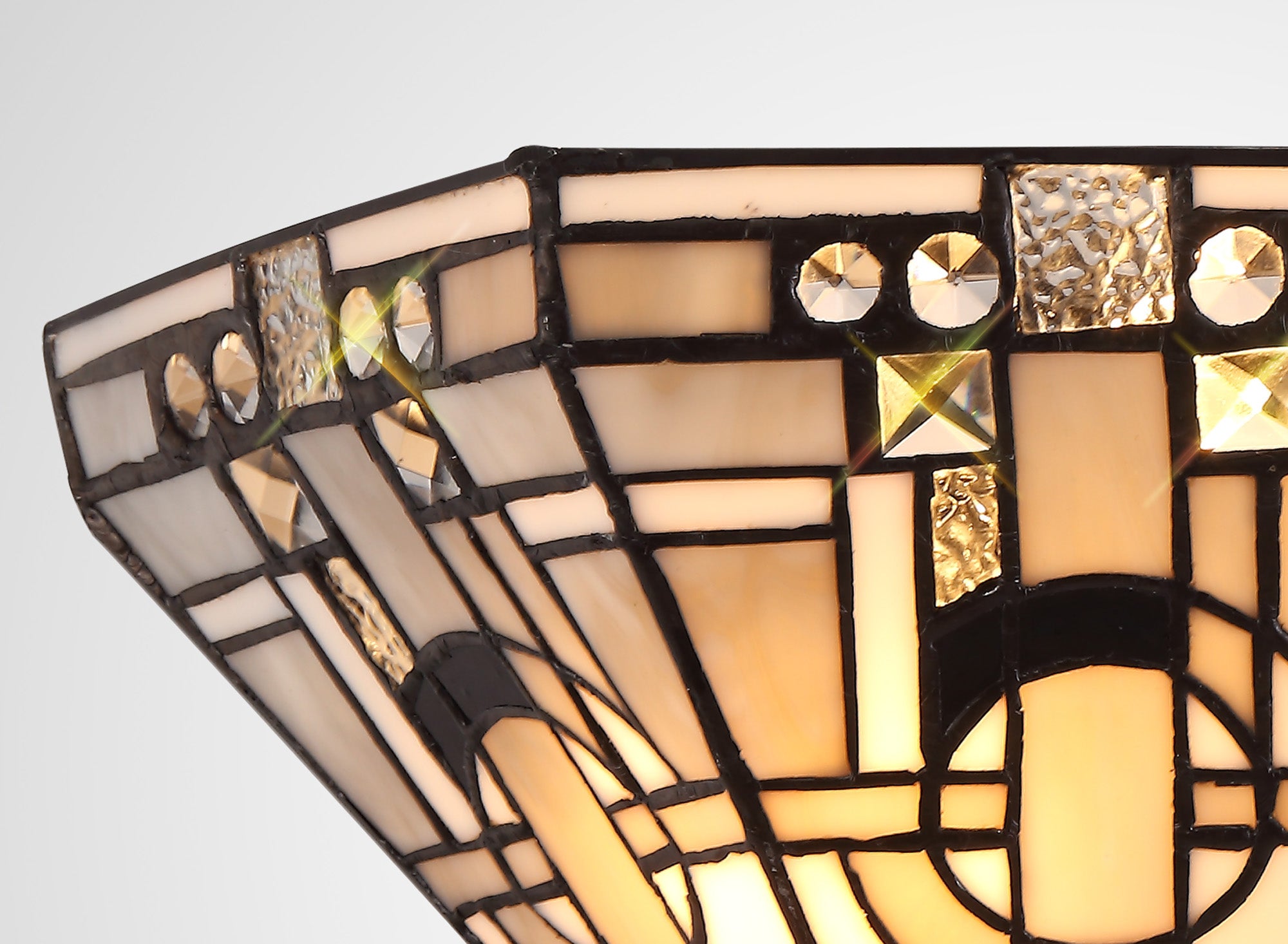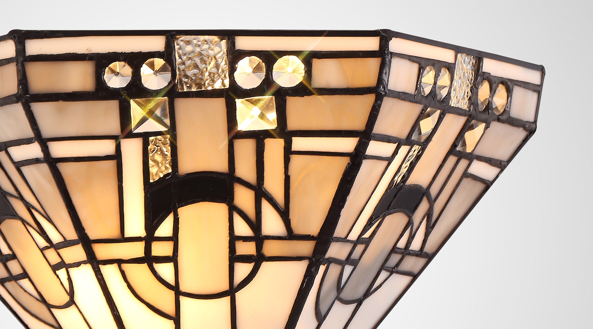 Atek takes its name from the inspiration of its design. The vintage effect of the Tiffany glass is interpreted to reflect Aztecan artistic creations with the shapes and positioning of the glass pieces being furthered by the shape of the shade itself. Giving this range a subtle modern edge the shades are embedded with clear crystal pieces in keeping with the monochrome palette of coloured glass. The Atek range includes two non-electric shades and a 1 light wall lamp.