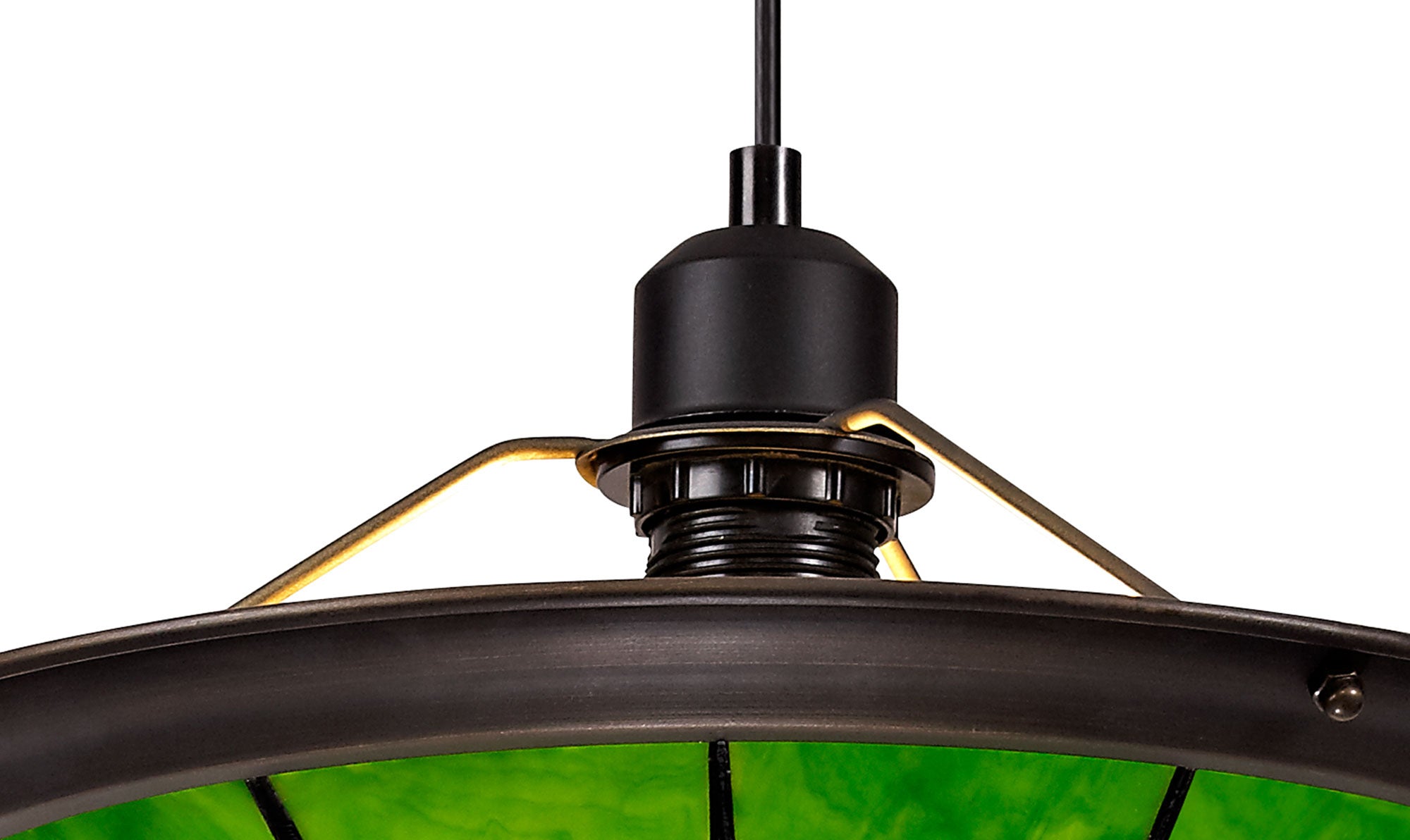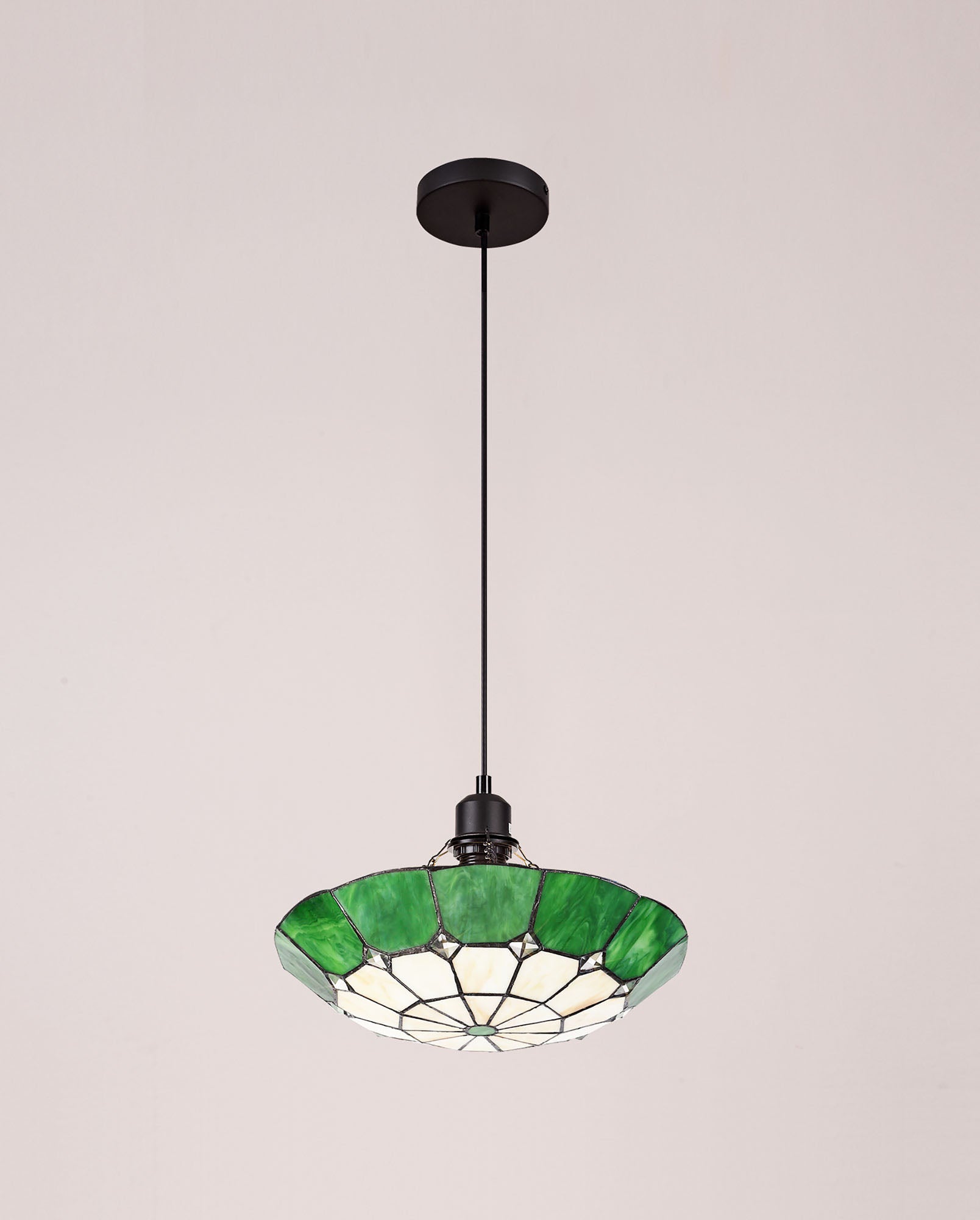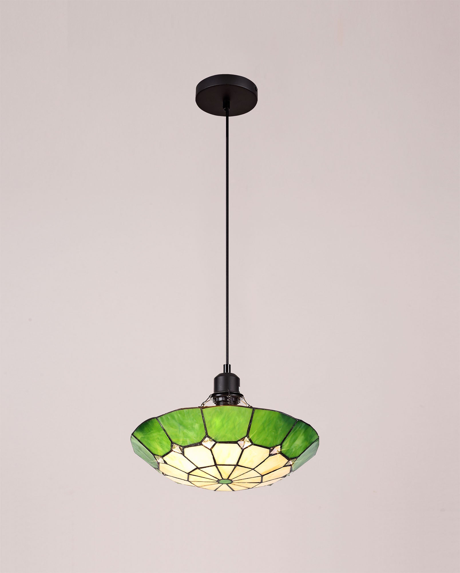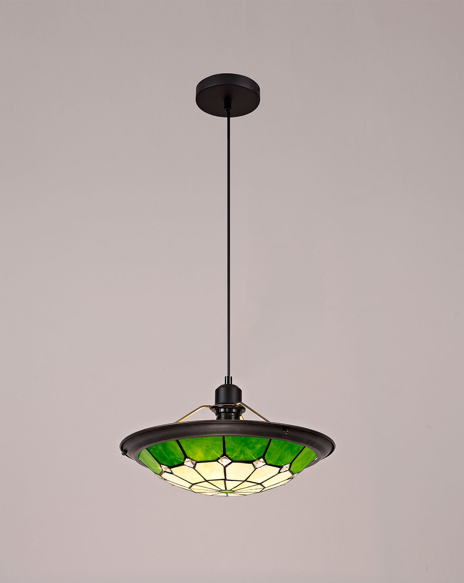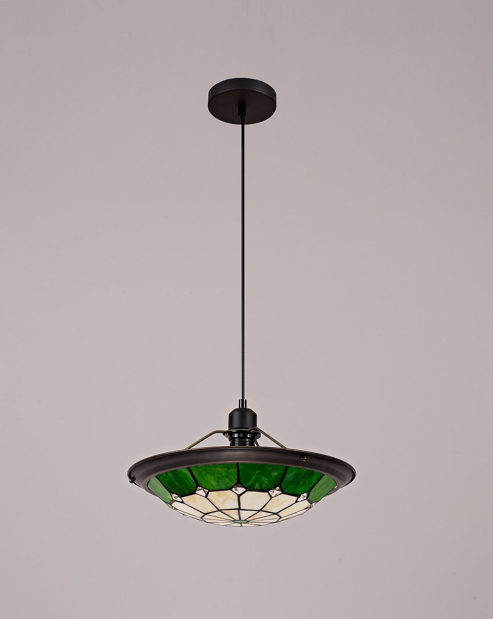 Austiffany 1 Light Pendant E27 With 35cm Tiffany Shade, Cream/Green/Clear Crystal Centre/Aged Antique Brass Trim/Black