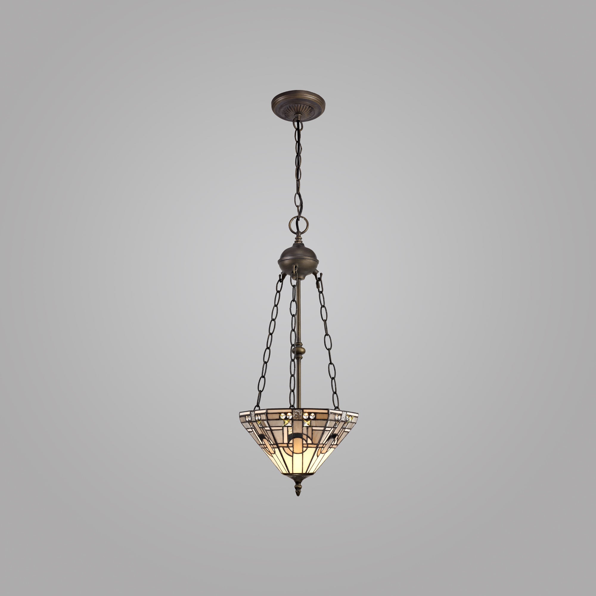 Atek 2 Light Uplighter Pendant E27 With 30cm Tiffany Shade, White/Grey/Black/Clear Crystal/Aged Antique Brass