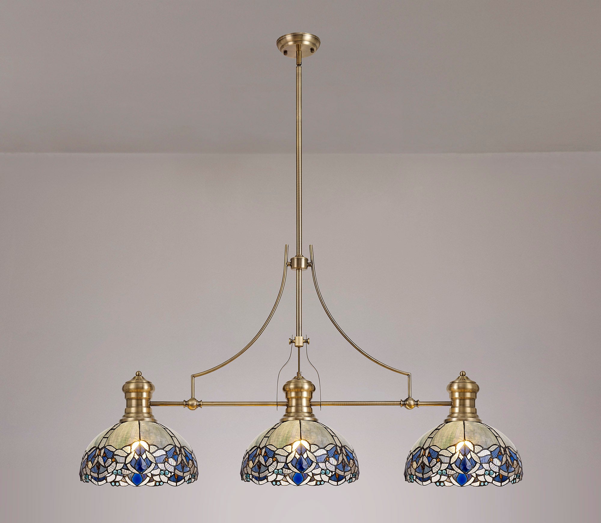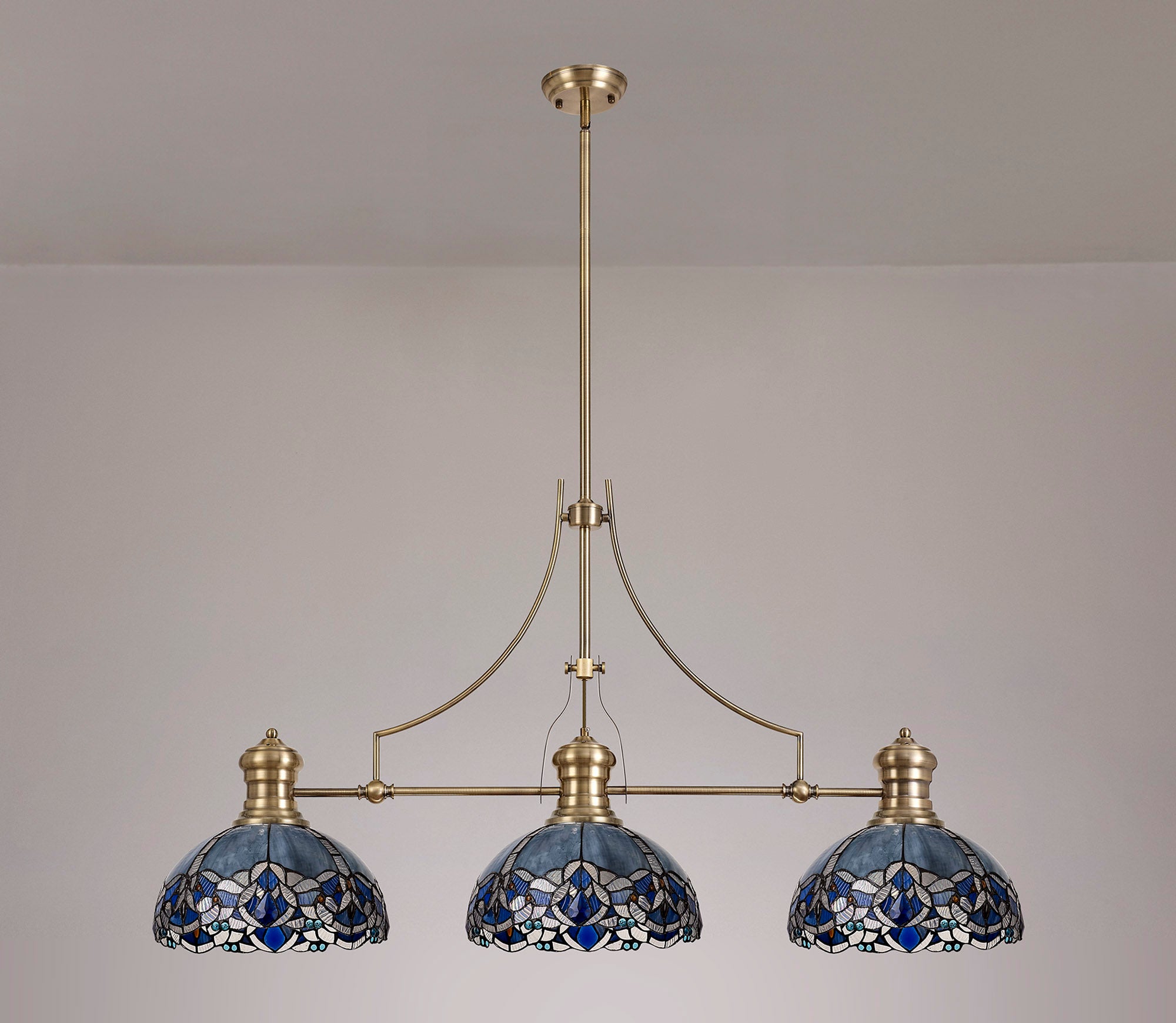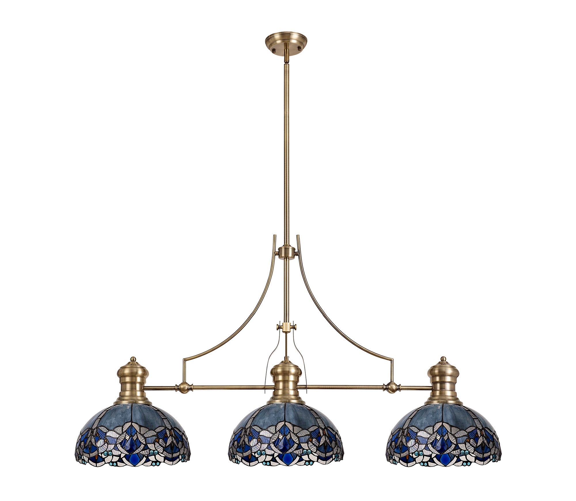 Docker, Oseki 3 Light Linear Pendant E27 With 30cm Tiffany Shade, Antique Brass, Blue, Clear Crystal