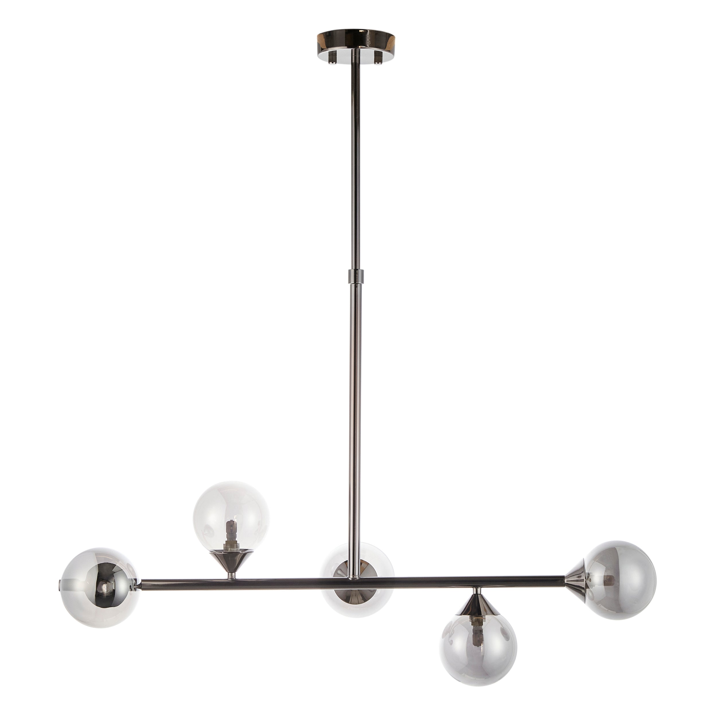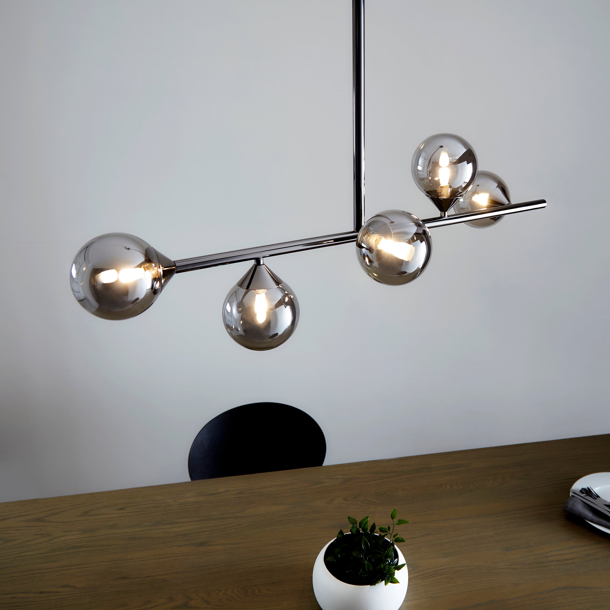Modern statement 5 light pendant with smoked mirror shades set against black chrome plate. Ideal for creating a stylish centrepiece in a dining or living room. Matching items also available.
