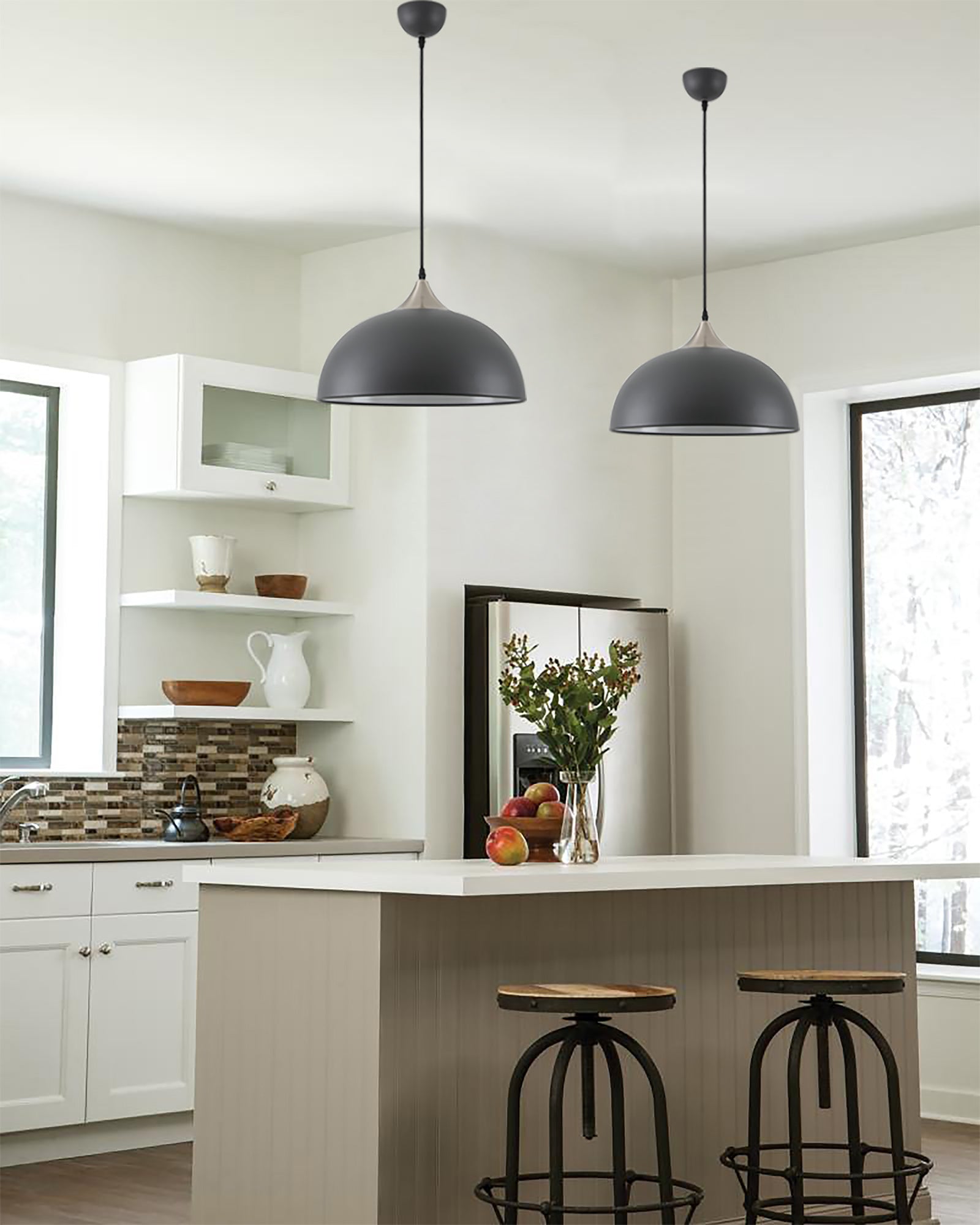 A uniform bowl shape forming the Atanja collection, provides ample shade for the downward directionality of light from the E27 lampholder which it houses. Their dome ceiling cups reflect the form of the 38cm and 50cm metal shades shape allowing a cohesive design. The sand effect of the neutral colour finishes available partner well with the small satin nickel components ensuring the light blends with the d�_cor of its chosen setting.