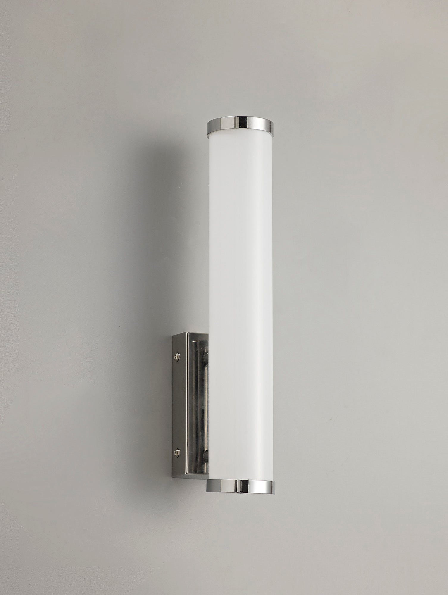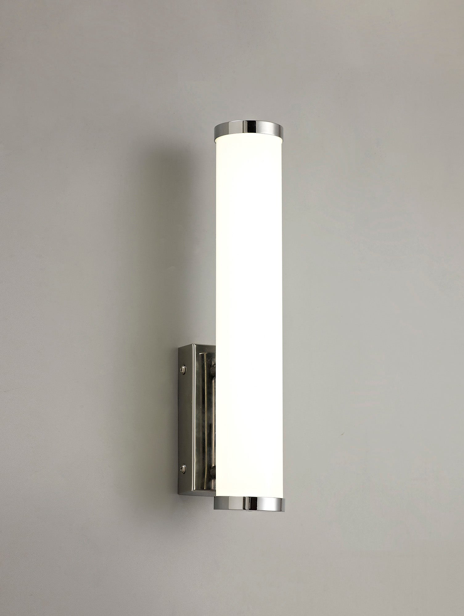 Tela's tubular opal white diffusers ensure a complete ambient dispersal of lumination from the integral LEDs. The cool 4000K colour of the LEDs is the ideal temperature for IP44 rated bathroom fixtures where a bright clearer light is required. Three various wall lamps and a ceiling light are finished in polished chrome giving a further modern touch to the collection.