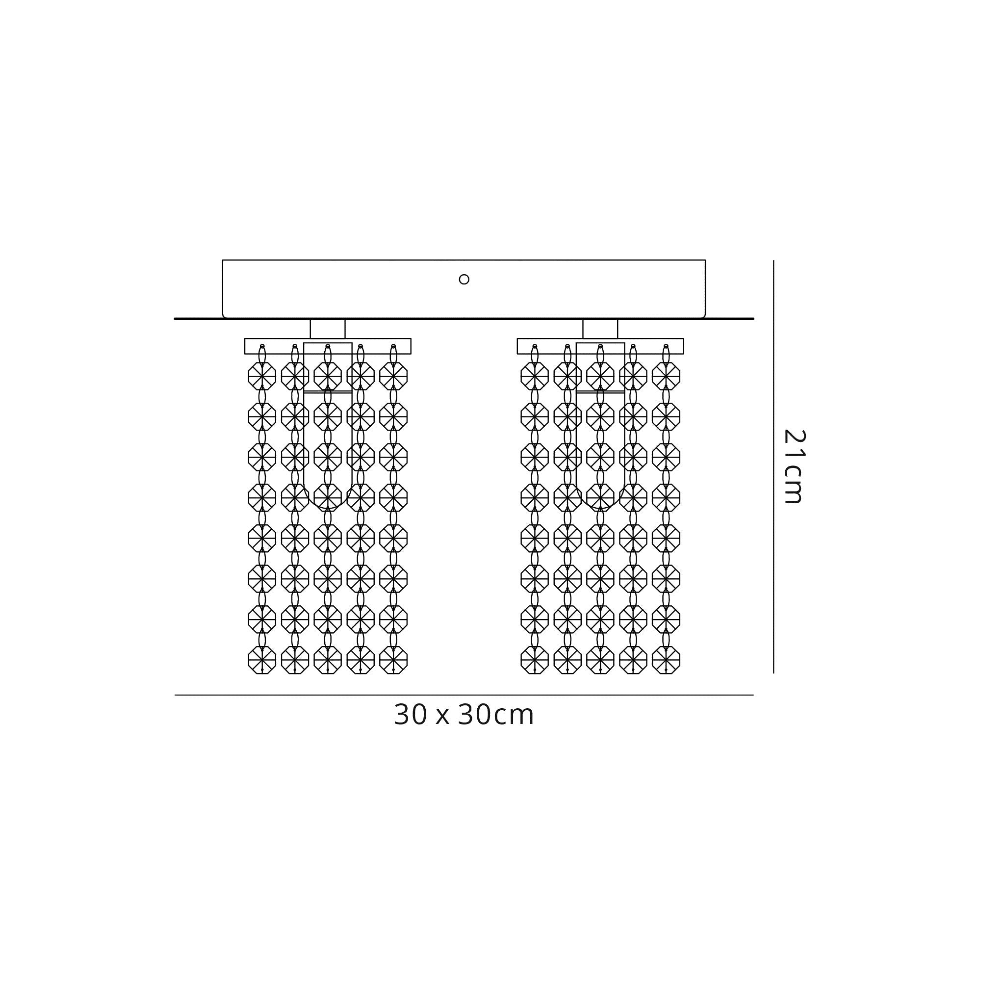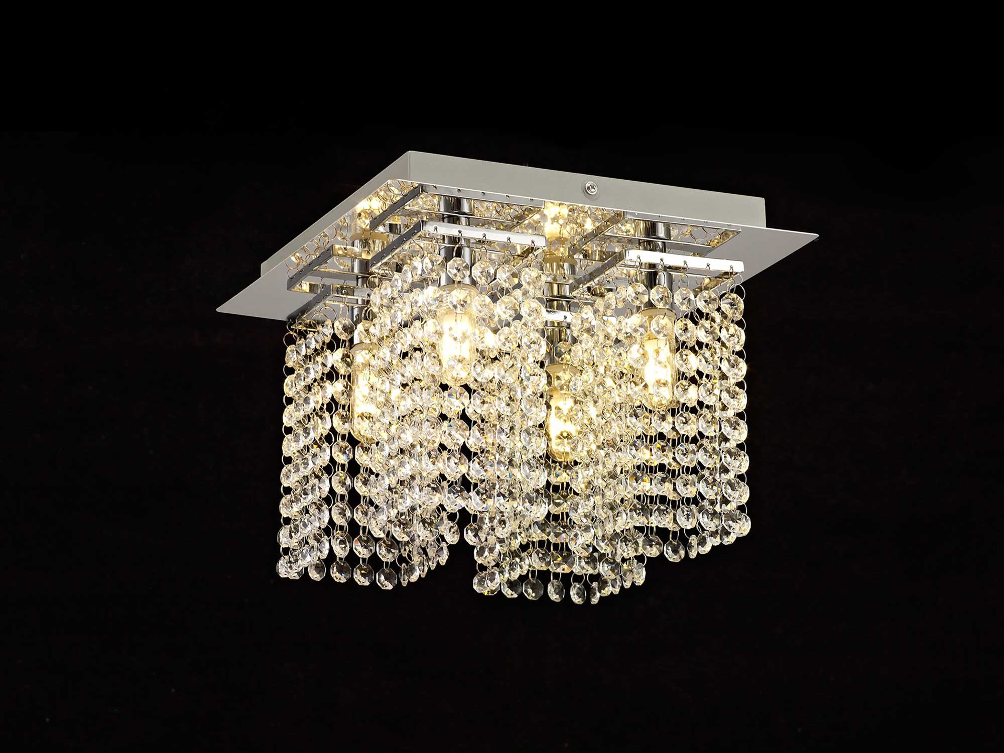 Ariana's simple square framework finished in polished chrome provides an unassuming backdrop to ensure the focal point of the range are the strands of clear crystal buttons. Drops of crystal buttons are a staple for many crystal fittings however Ariana arranges these pieces into cohesive square shapes. When combined with the generous number of crystals on each drop the format creates a crystal cube around the G9 lampholders. The light from the G9's refracts through the crystals forming interesting spectral patterns. An encasing around the G9 lampholders gives each light in the range an IP44 rating offrineg a stunning crystal option for bathrooms.