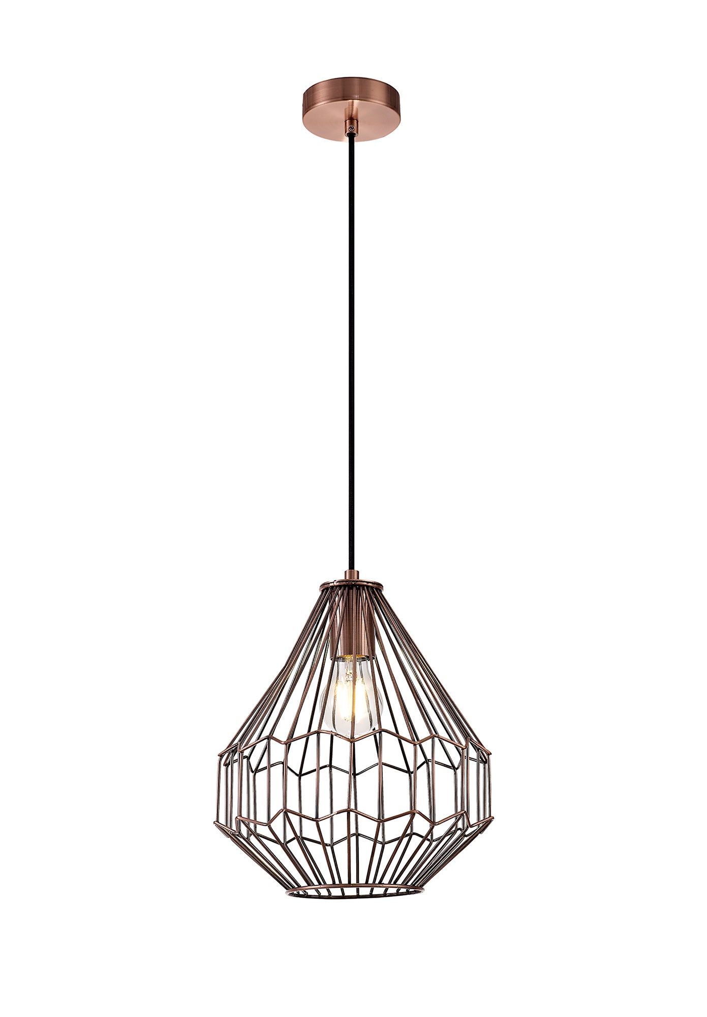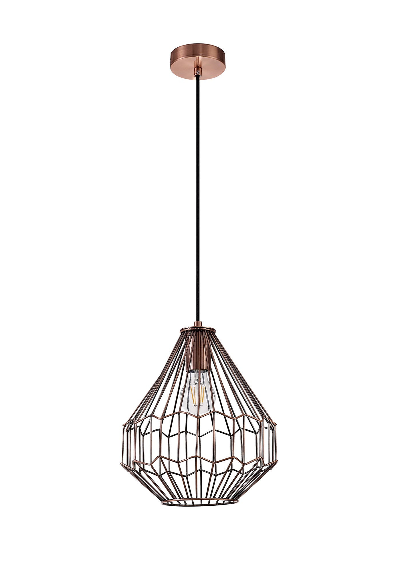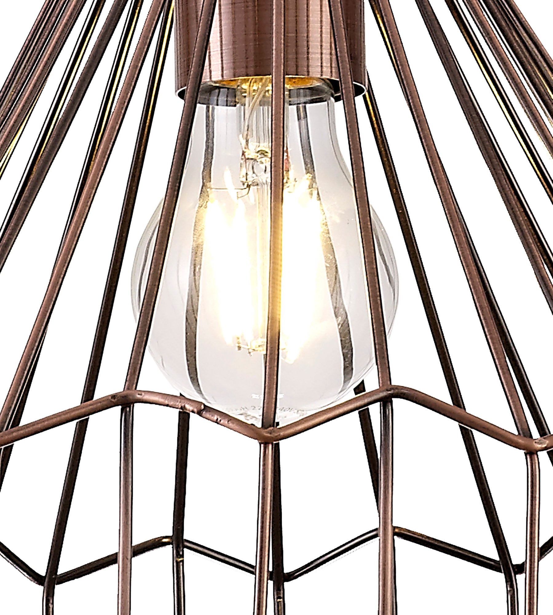With geometric shapes and form, the Valentina range includes two pendants finished in a stunning Antique Copper/Black, ideal for use within a traditional atmosphere or even to bring a touch of contemporary ambience to a modern space. The wired format of the metalwork allows an open uninhibited dispersal of light from the E27 lampholder. Both lights take a maximum 60W ensuring an extensive amount of illumination is achievable.