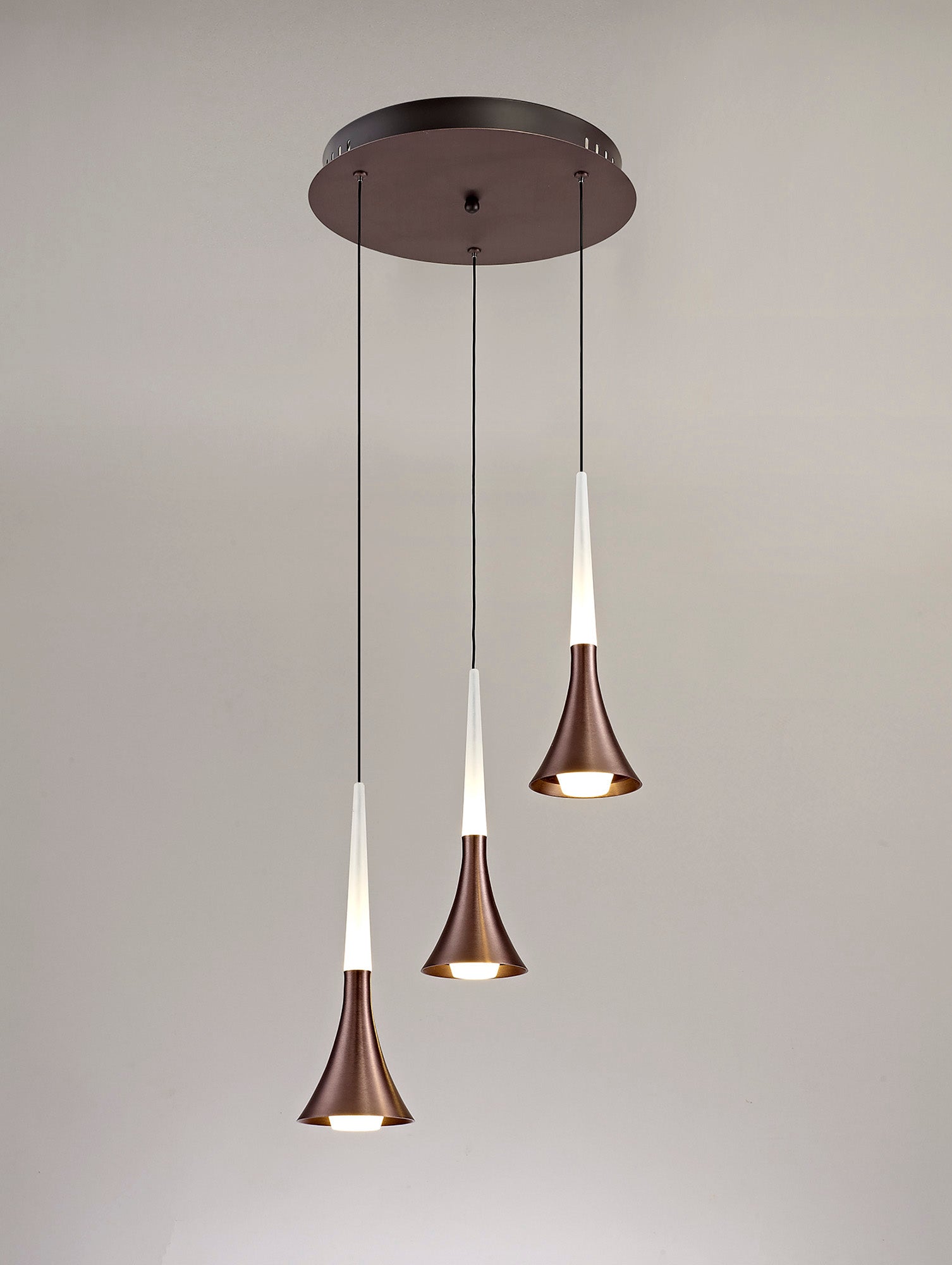 A collection of sleek pendants, Lucile's modern flared cone shape creates a funnel effect enhancing the light emitted from the integral 3000K LEDs. The satin brown colour finish of the metal framework provides a more adaptable option for neutral room settings where a warmer feature is required, without compromising the benefits of modern LED technology. Available in a single pendant, round 3 light pendant or linear 3 light pendant, this range is appropriate for illuminating a smaller room or enhancing a dining area.