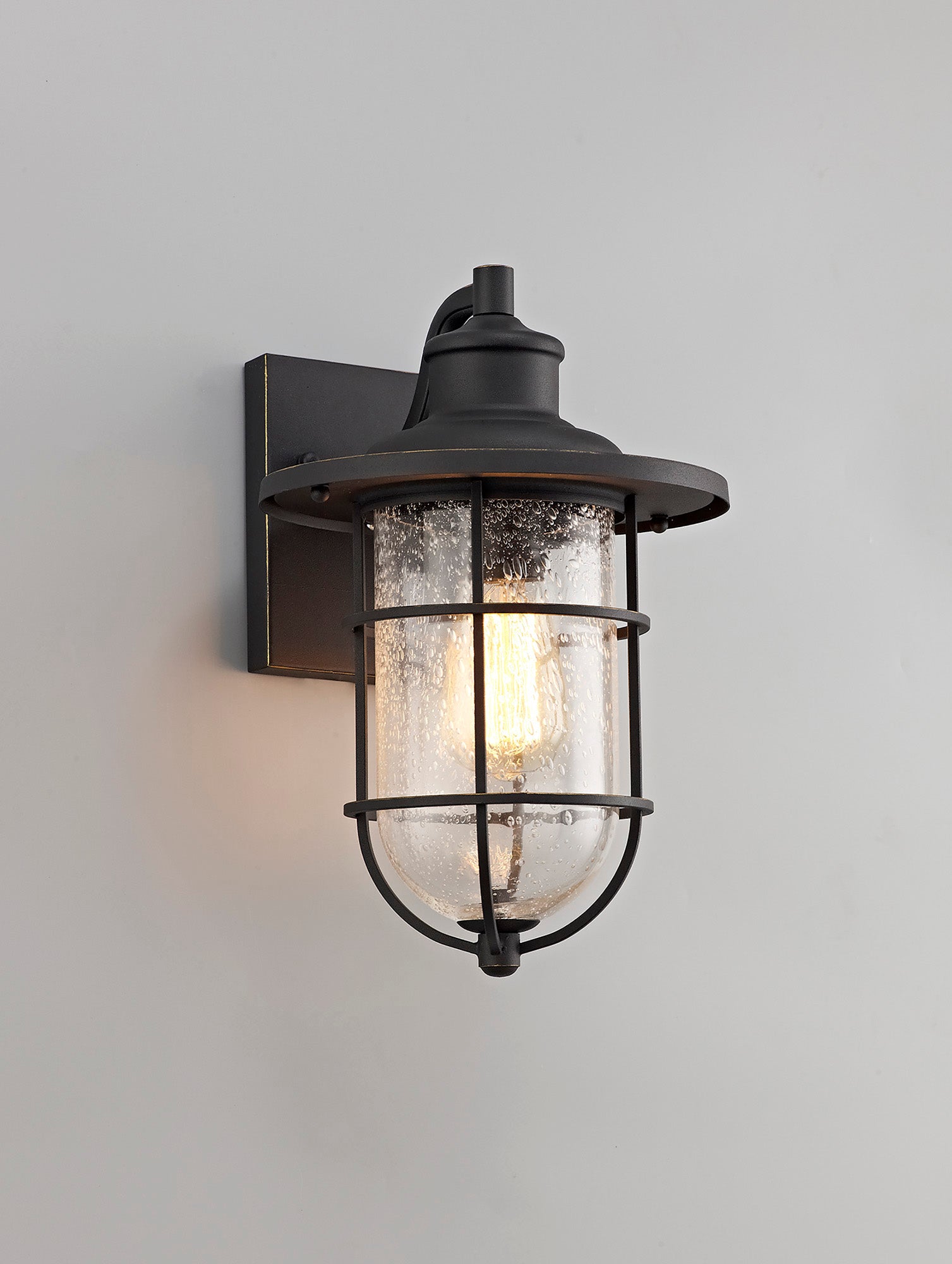 Nautica's wall lamp and pendant follow a vintage theme reminiscent of the classic lanterns used on sailing boats. A clear bell shaped glass, formed with small bubbles to replicate fine drops of water, safely houses an E27 lampholder. The nautical nature of the gridline frame complements the glass feature whilst providing an added defence against outdoor elements. The black colour finish with gold trim also enhances the ranges durability.