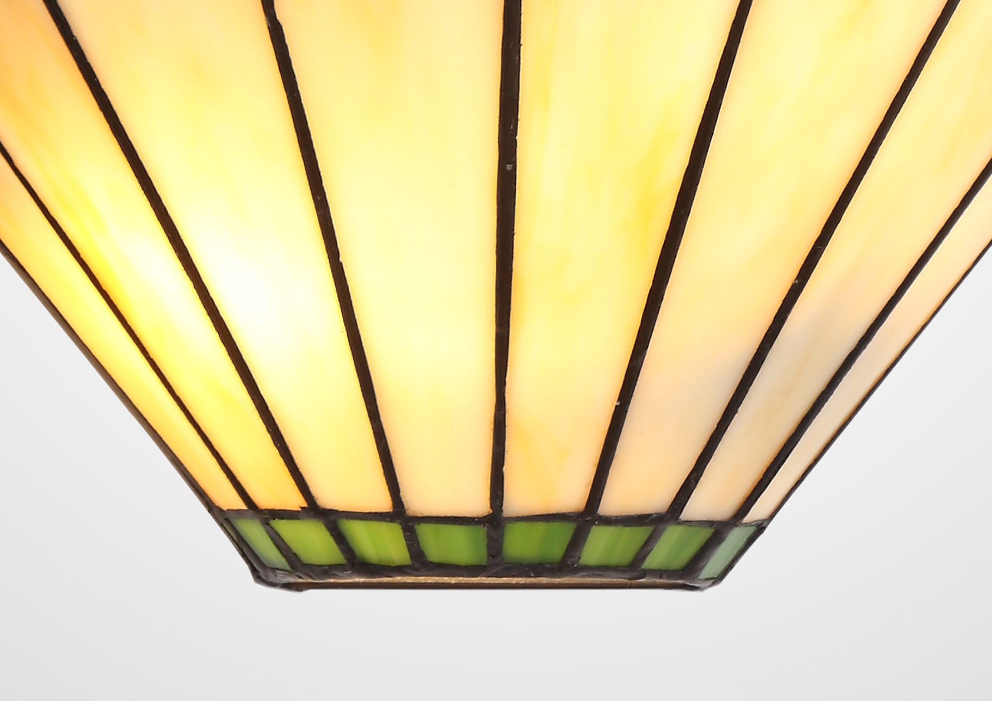 Umbrella uses a traditional Tiffany shade but with a modern twist. The fanned feather shapes forming the umbrella glass is mostly crealm coloured with the curved tips of each point available in either green, brown, red, purple or grey. The modern component takes the form of small clear crystal pieces fixed on alternating points of the shades rim furthrineg the ranges noble appeal.
