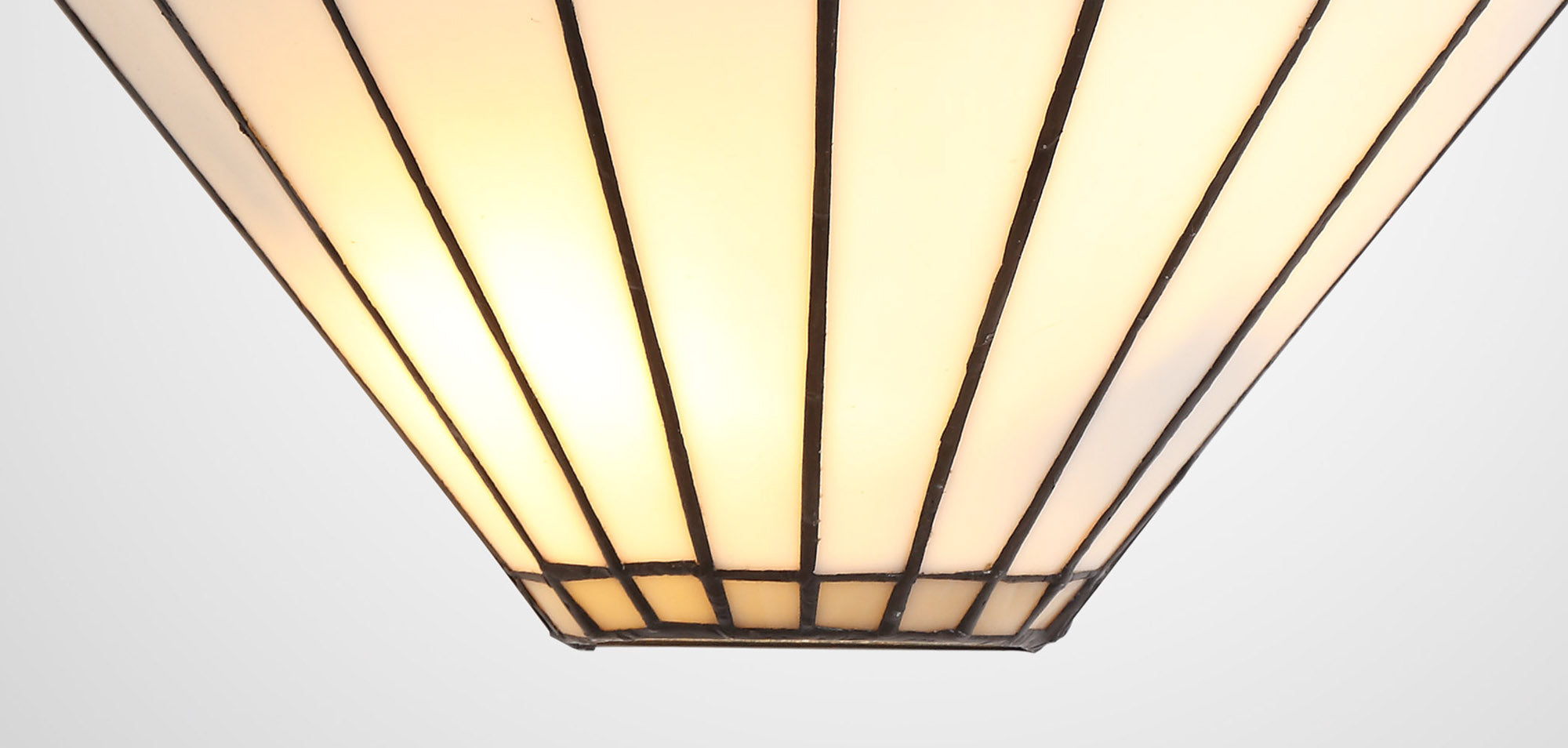 Umbrella uses a traditional Tiffany shade but with a modern twist. The fanned feather shapes forming the umbrella glass is mostly crealm coloured with the curved tips of each point available in either green, brown, red, purple or grey. The modern component takes the form of small clear crystal pieces fixed on alternating points of the shades rim furthrineg the ranges noble appeal.