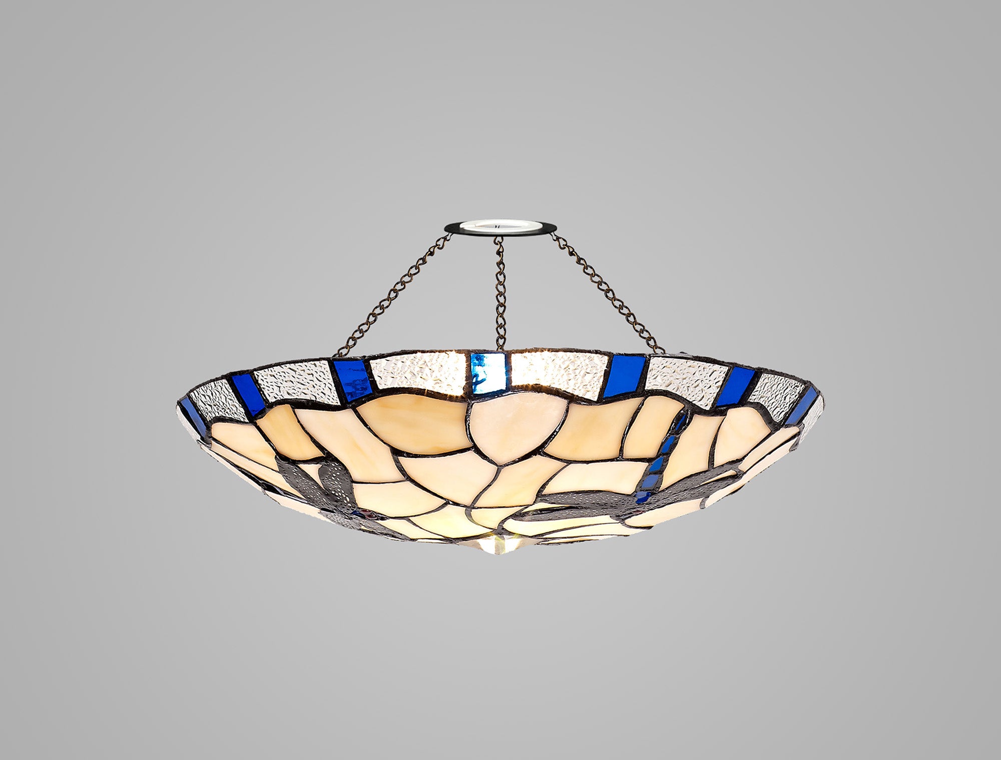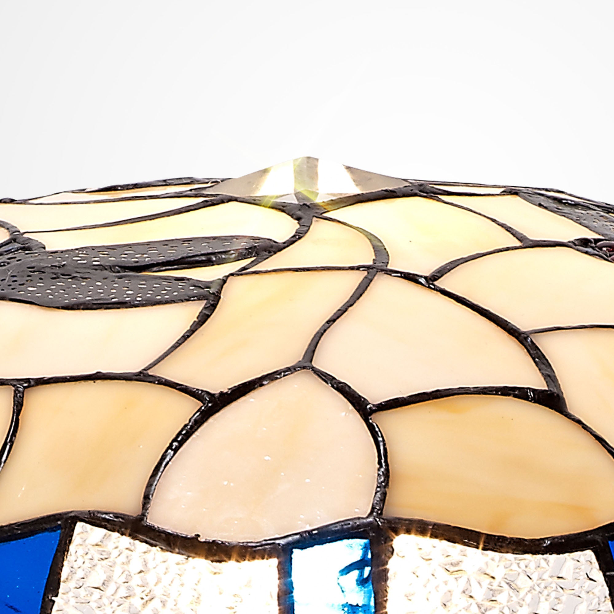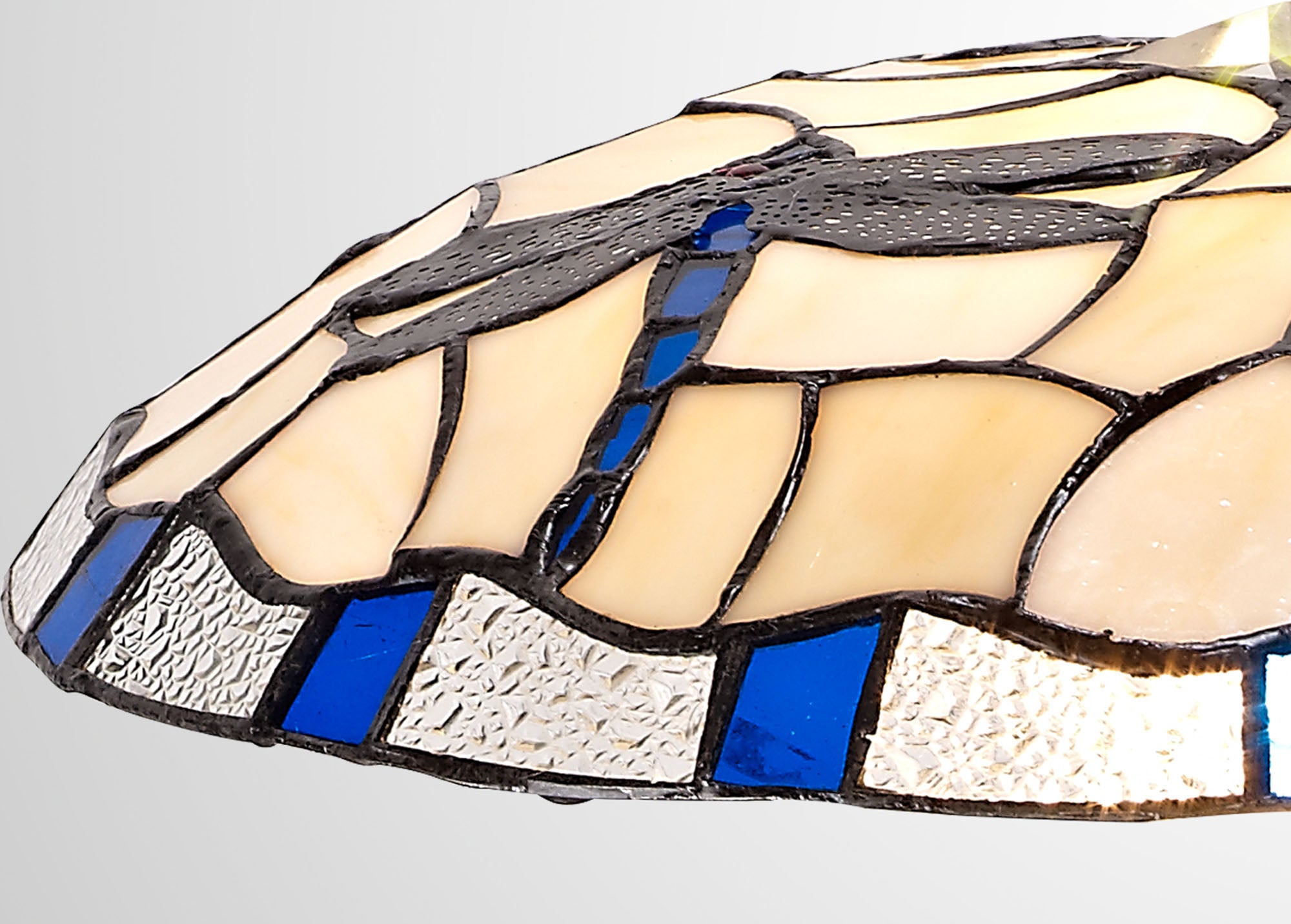 A classically traditional Tiffany shade collection, Adena pairs primary colours with a more neutral crealm to create a ovolanced combination of beautiful Tiffany glass. The famialiyar dragonfly pattern is slightly modernised with the clear crystal pieces in place of the more expected glass drops adding a touch of sparkle for a new age. Designed for use with an uplighter kit, Adena is a perfect representation of all Tiffany glass has to offer.