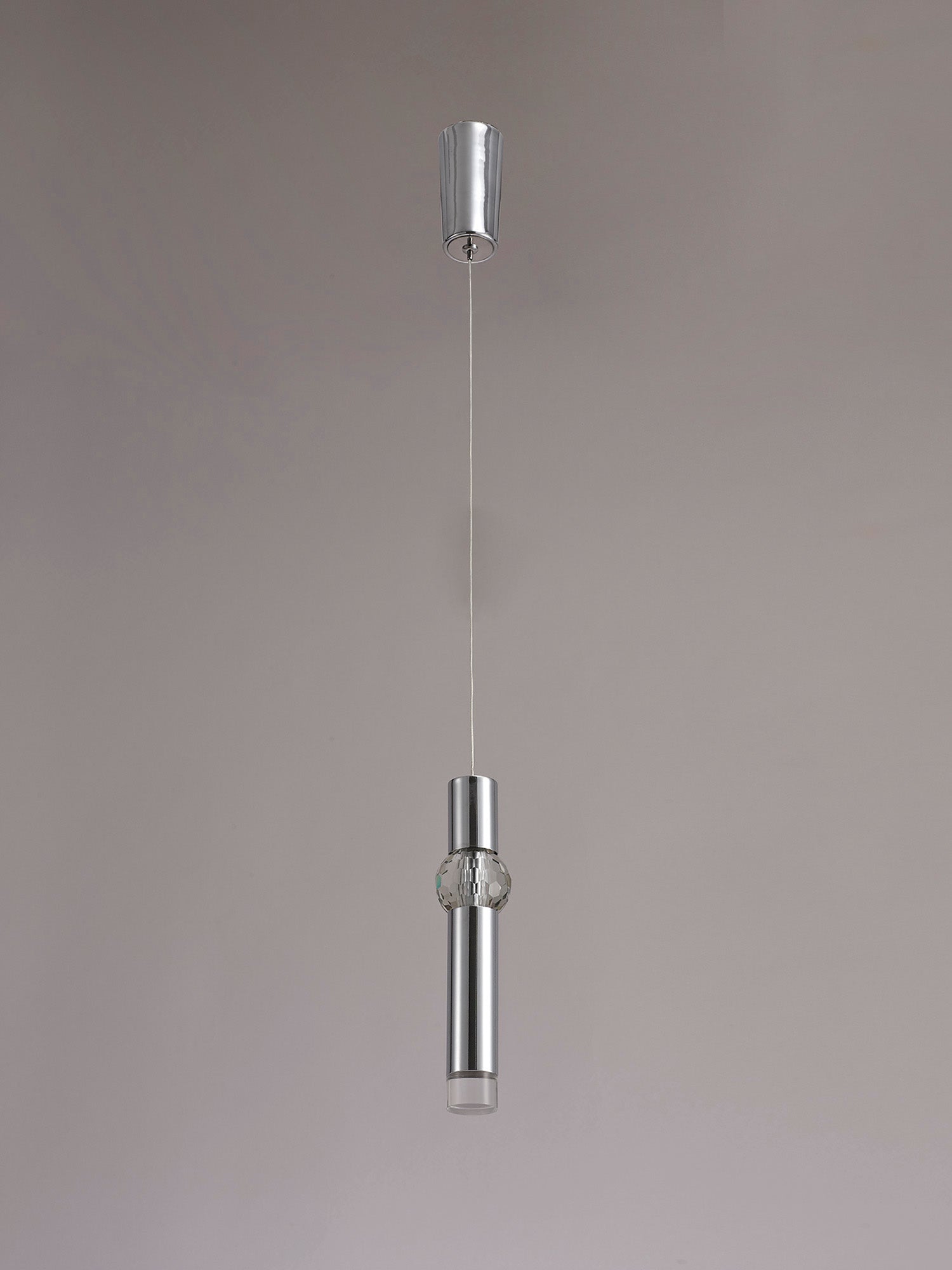 Aliya pendants offer a sleek and modern design that creates a futuristic aura with their slim polished chrome tubes. The integral LEDs emit a warm light filtered through the clear acrylic section at the bottom of each cylinder and the substantial spherical crystal sphere which produces spectral patterns with its faceted cut. Available as a single pendant, 3 light linear or 3 light round, there are ample applications that Aliya would be perfect for.