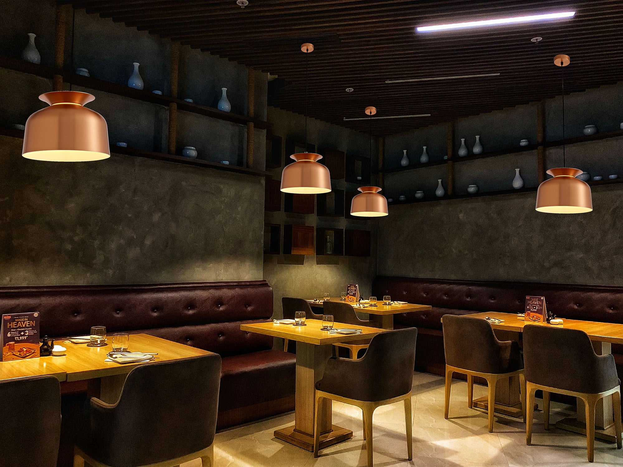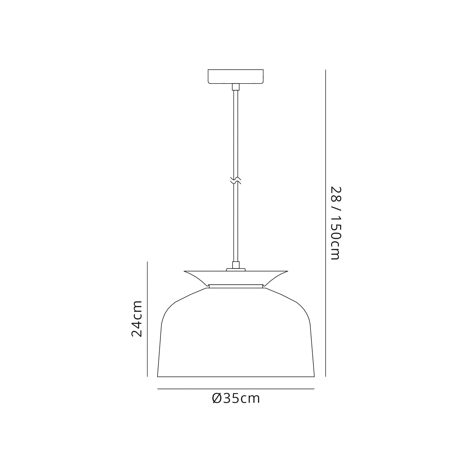 Domas is a collection of single pendants, the frames are formed from a larger dome shape and a shallow dish both positioned in different directions to outline the shape of a serving bowl. The slim diffuser where each piece meets has been added to give a soft haler of light in-between both shapes projected from the E27 lampholder which dispels the matan source of light from the larger open shade.