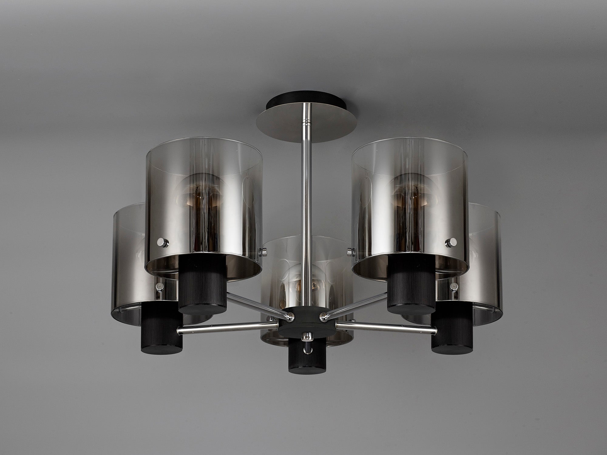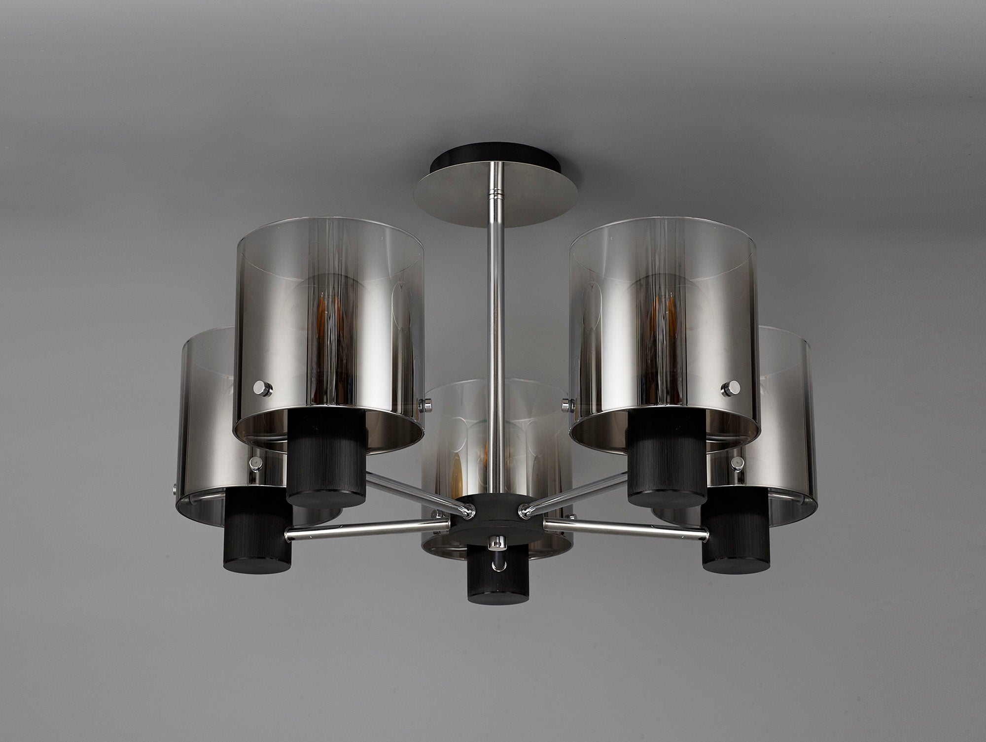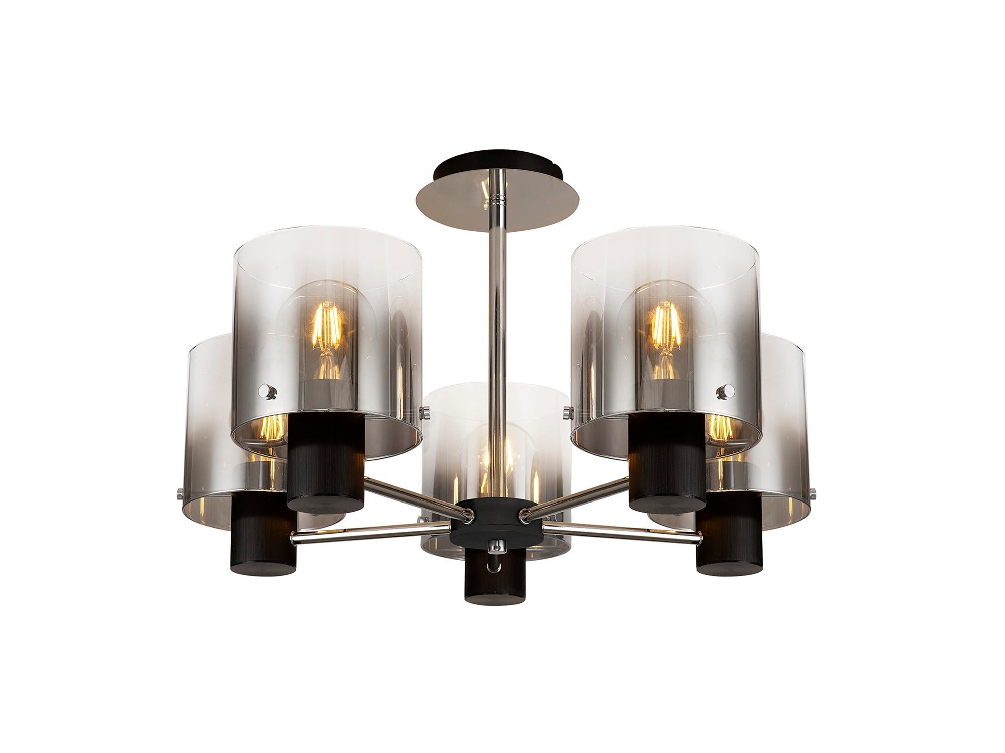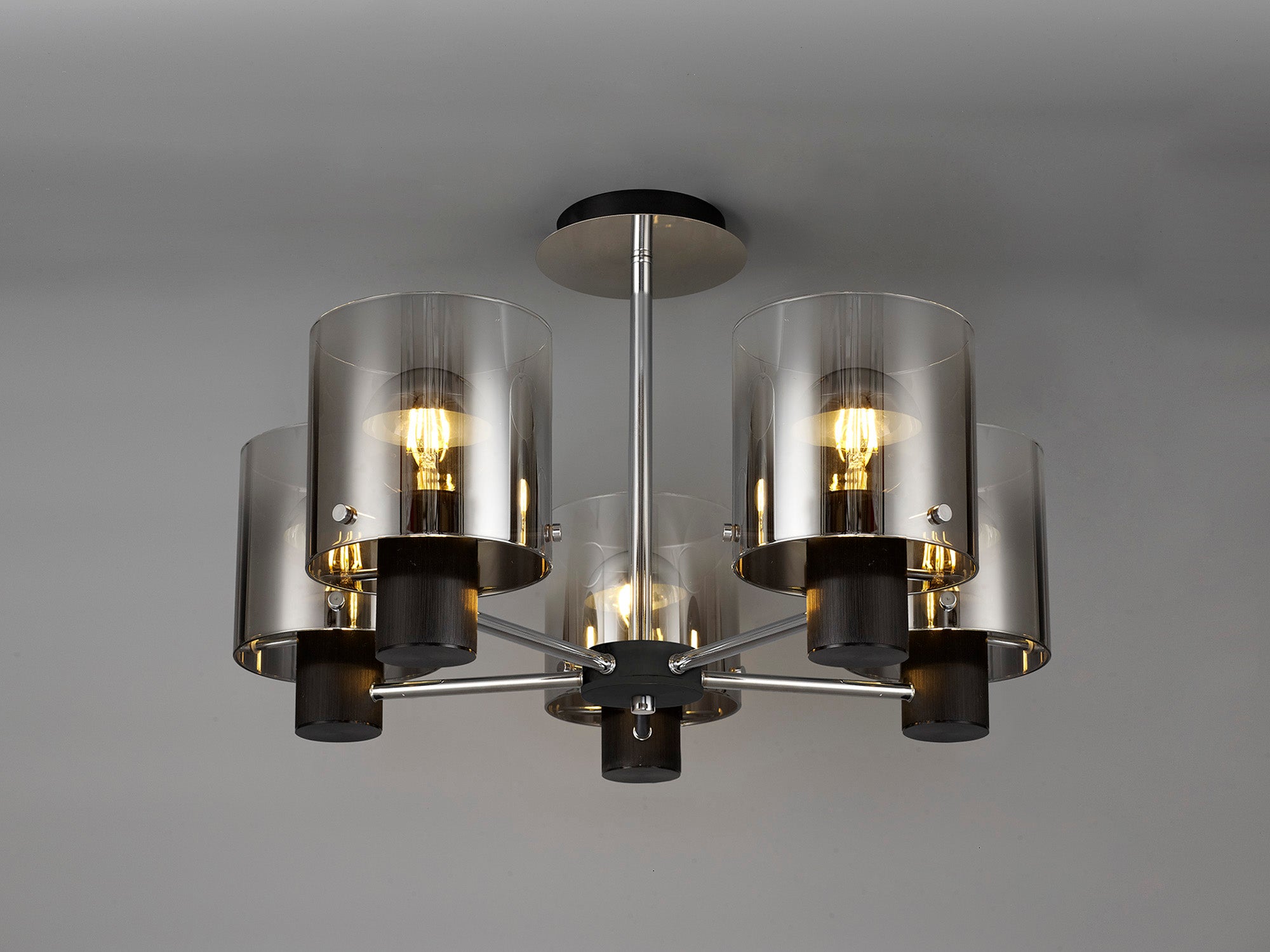 Lois 5 Light Black & Chrome Smoked Glass Semi flush Ceiling Light LO184023 This sophisticated fixture is designed to make a modern statement in any space, featuring quality metal construction and five black and chrome smoked glass shades.