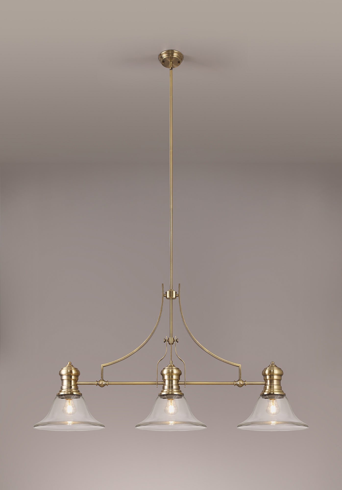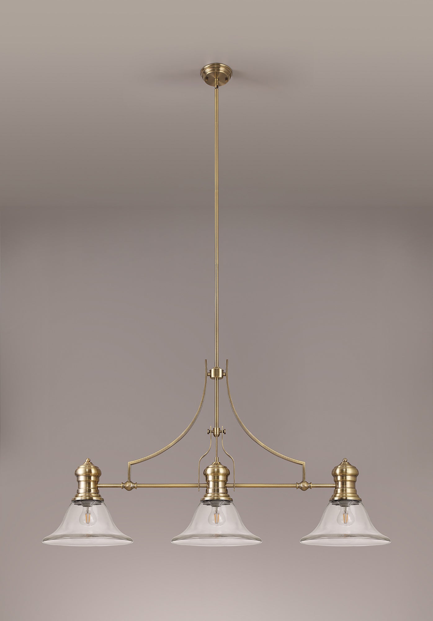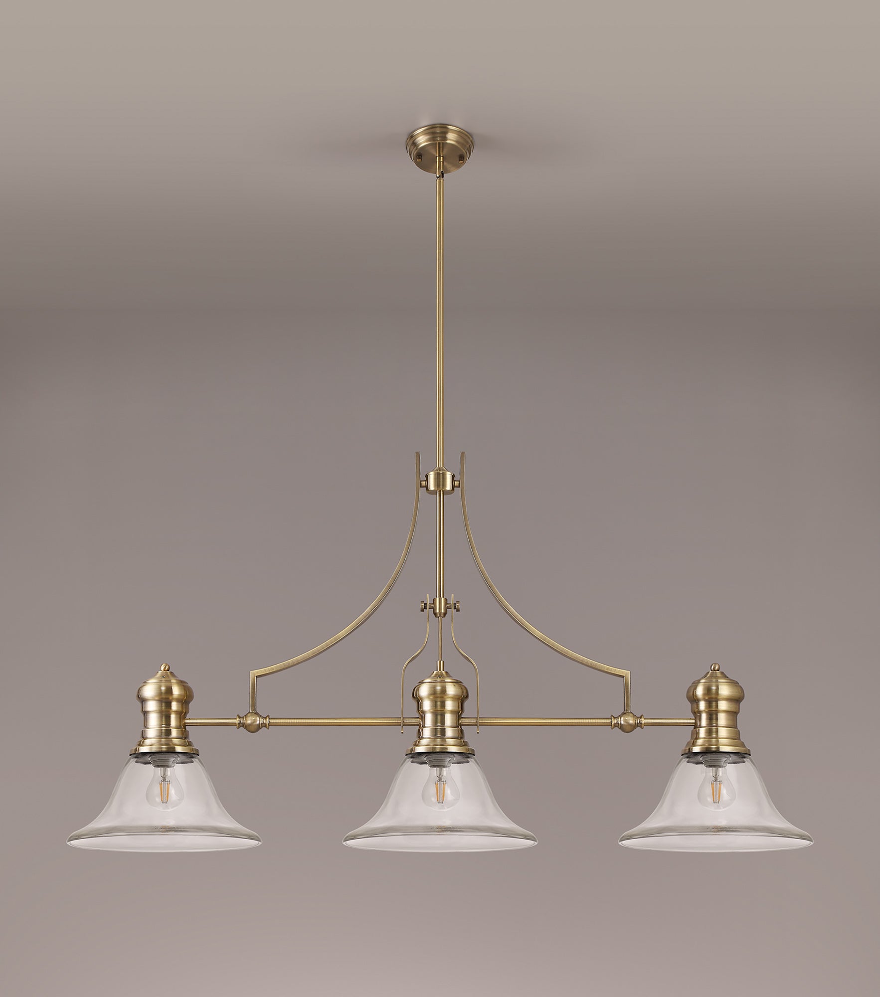 Docker 3 Light Linear Pendant E27 With 30cm Smooth Bell Glass Shade, Antique Brass, Clear
